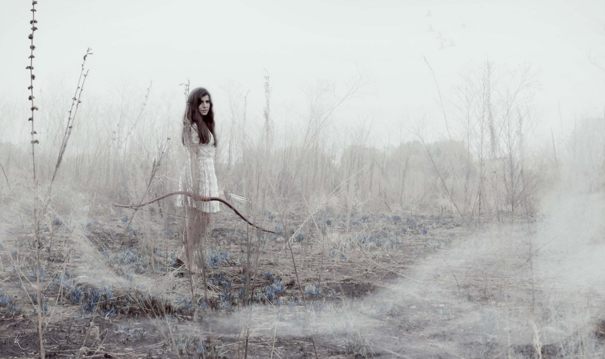 Das Mädchen ist eine Jägerin in einem Mantel mit einem Speer