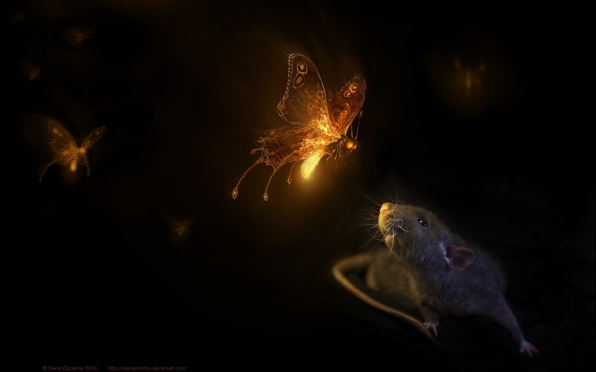 Maus und leuchtende Schmetterlinge auf schwarzem Hintergrund