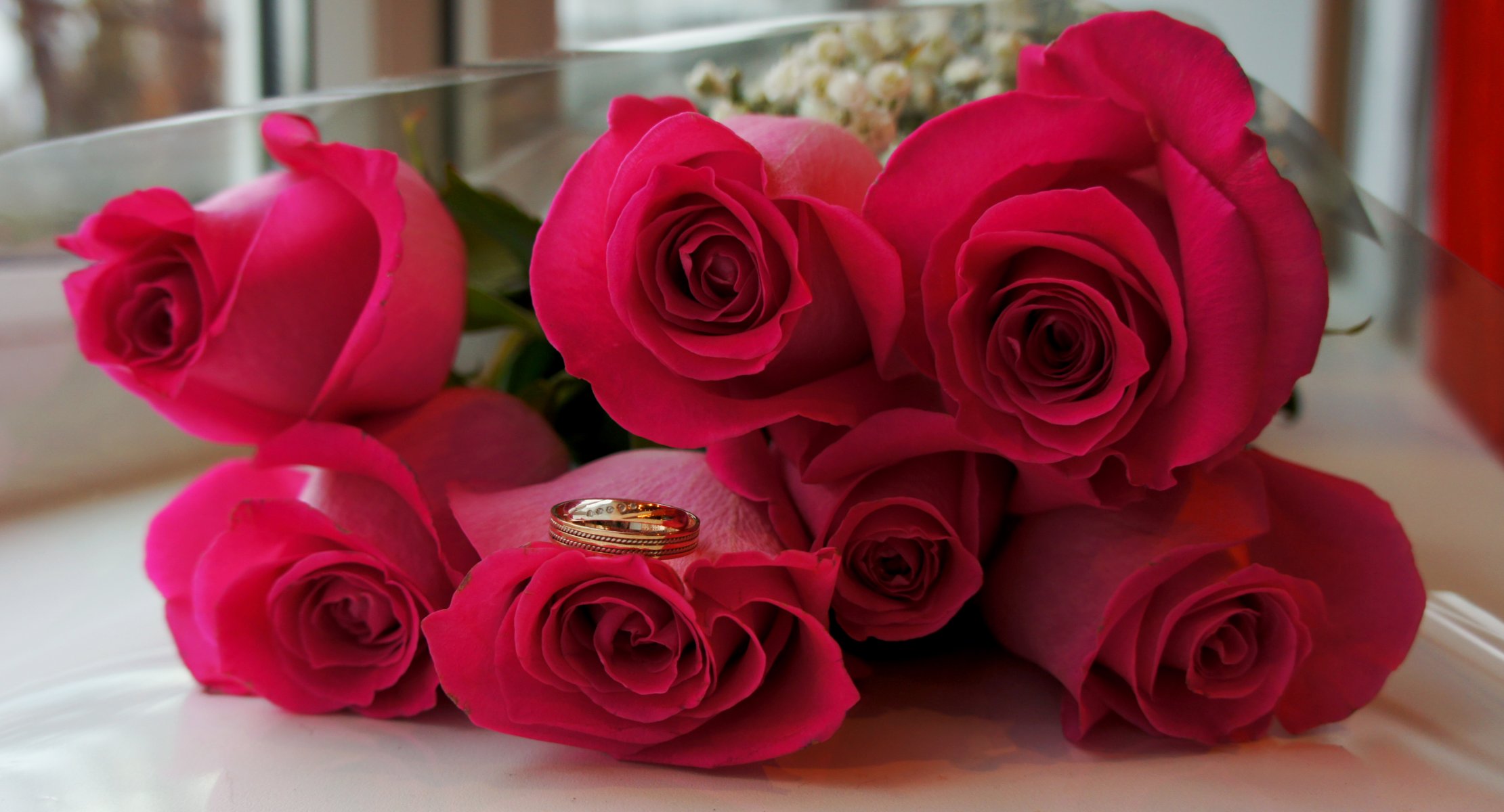 Ein Strauß Rosen auf dem Tisch. Auf der Knospe liegt ein Ring