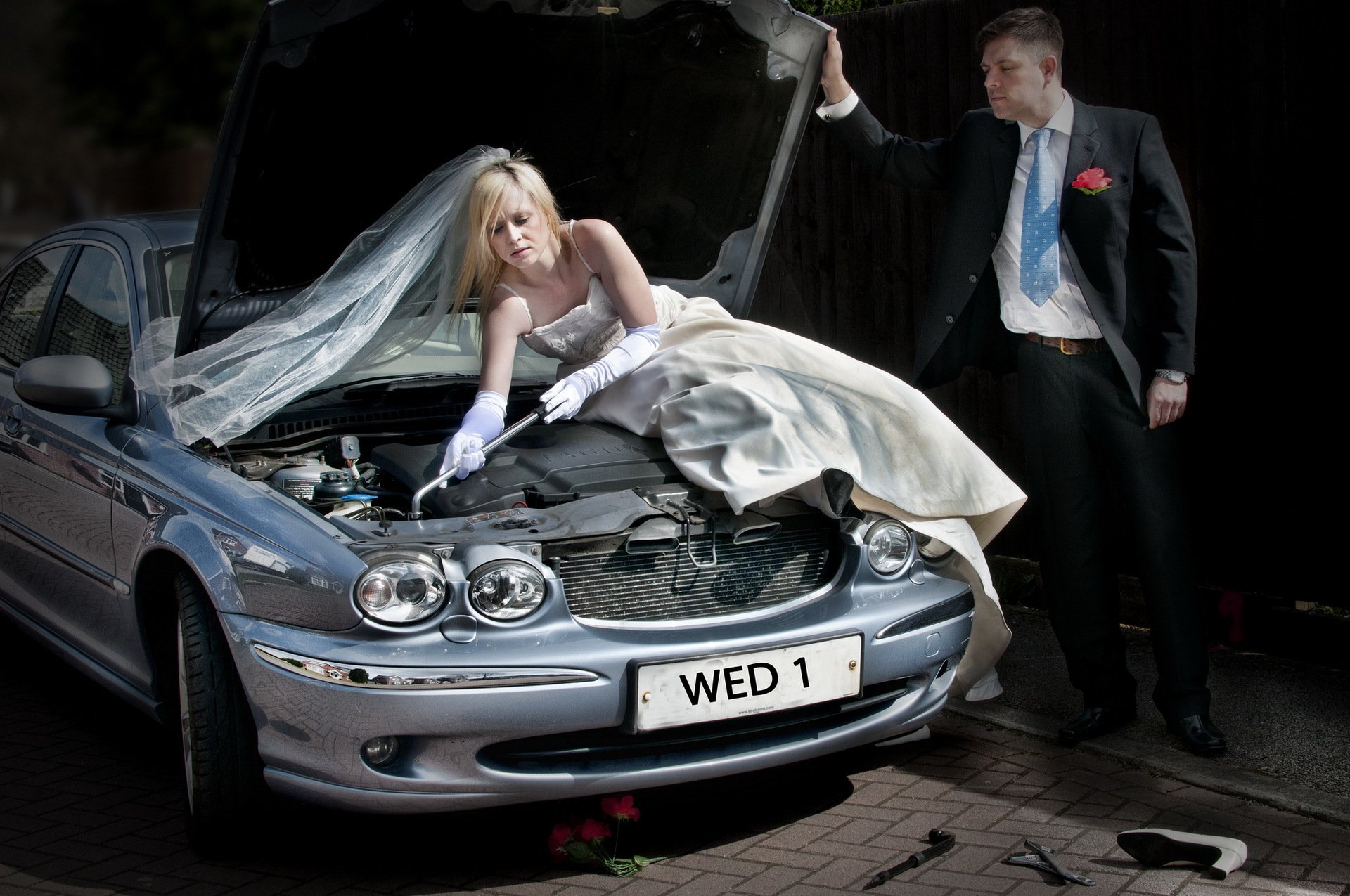 Die Braut im Hochzeitskleid liegt auf dem Rasen