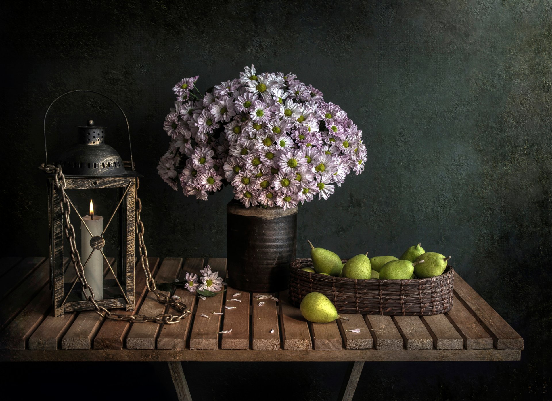 Stillleben mit blumen, birnen und kerzen
