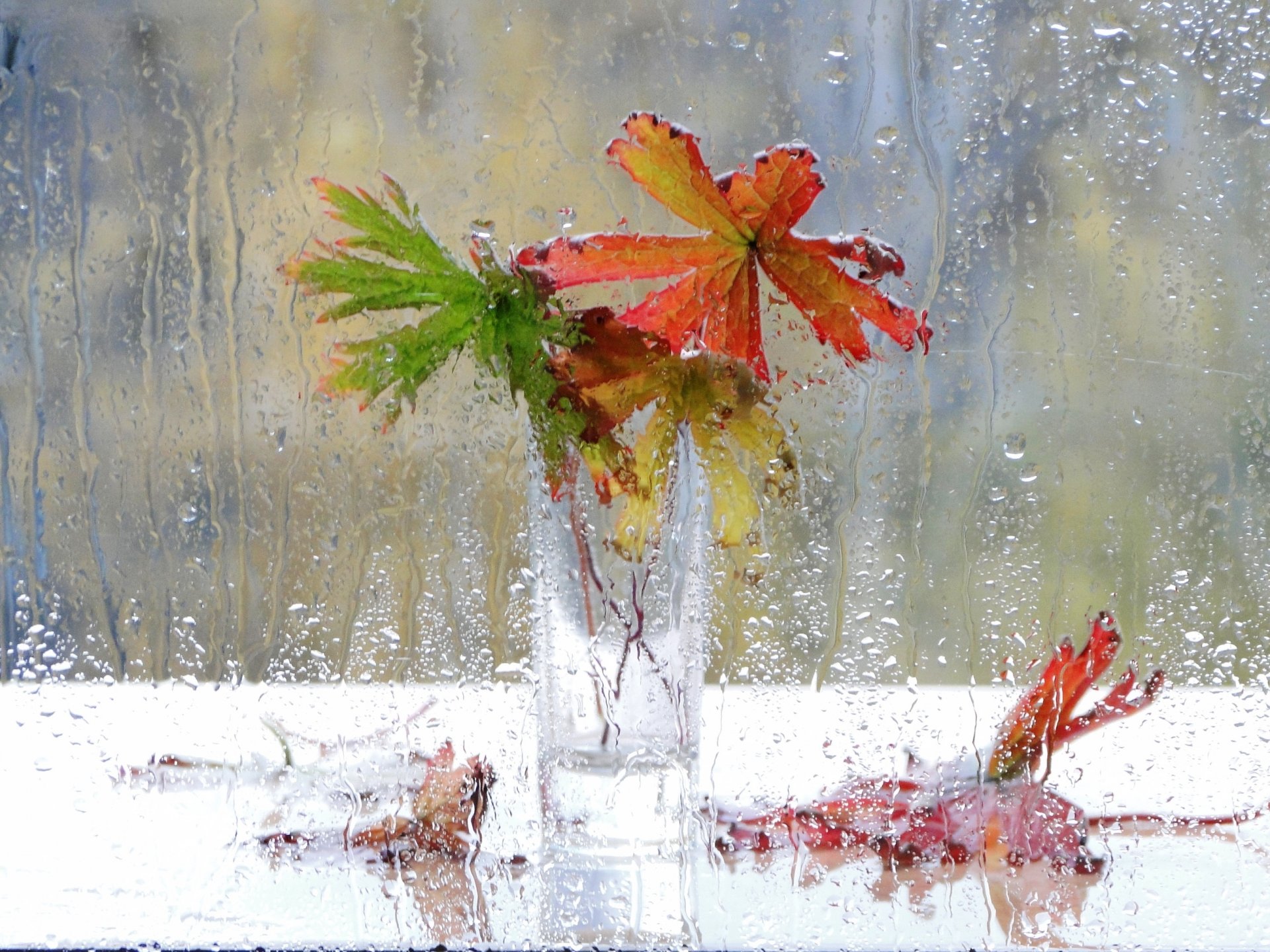 Blätter in einem Glas auf dem Tisch hinter einem regnerischen Fenster
