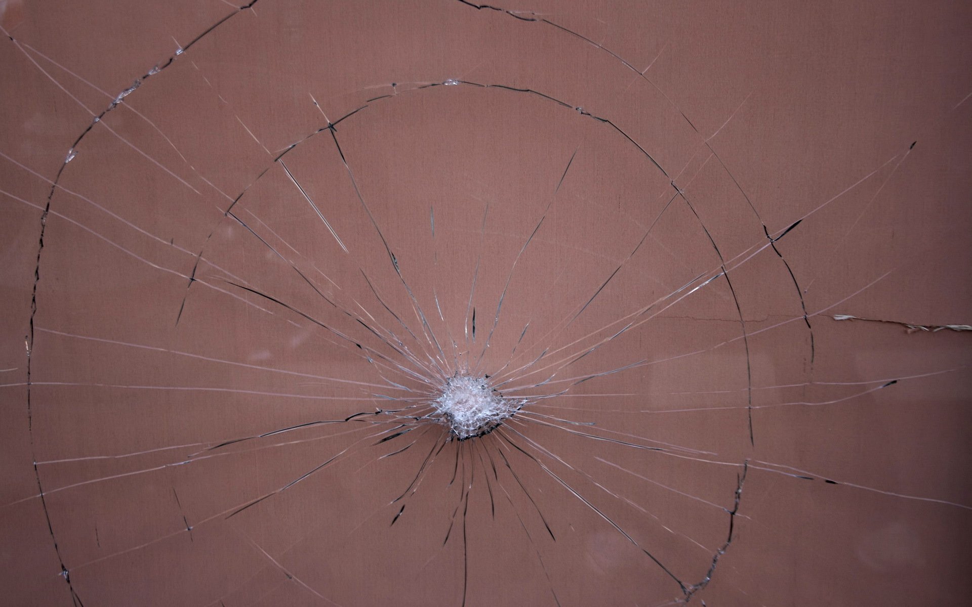 Zerbrochenes Glas mit einem gestauten Stein in der Mitte