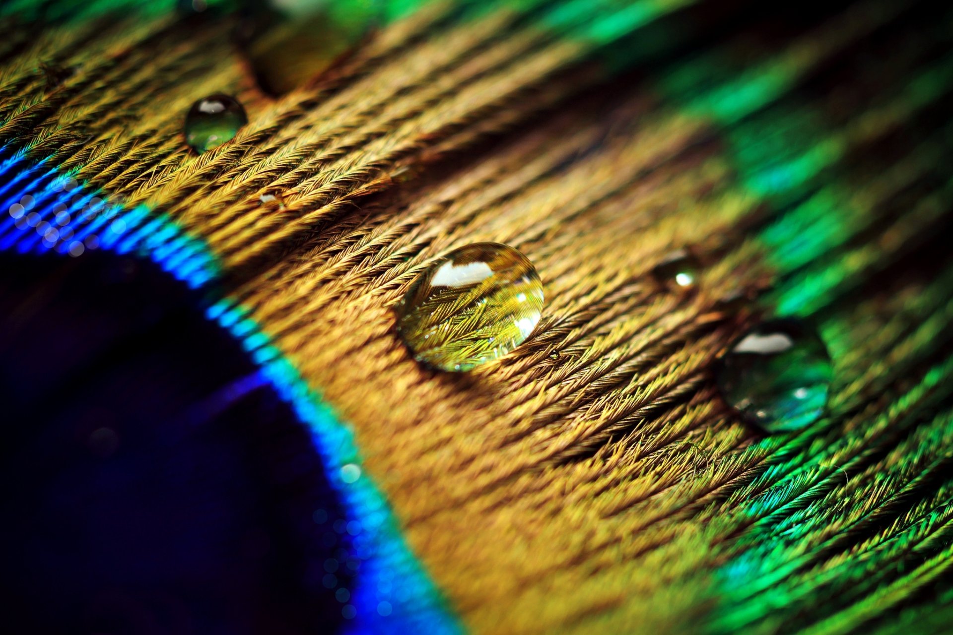 Nahaufnahme von Wassertropfen auf einem Pfauenrücken