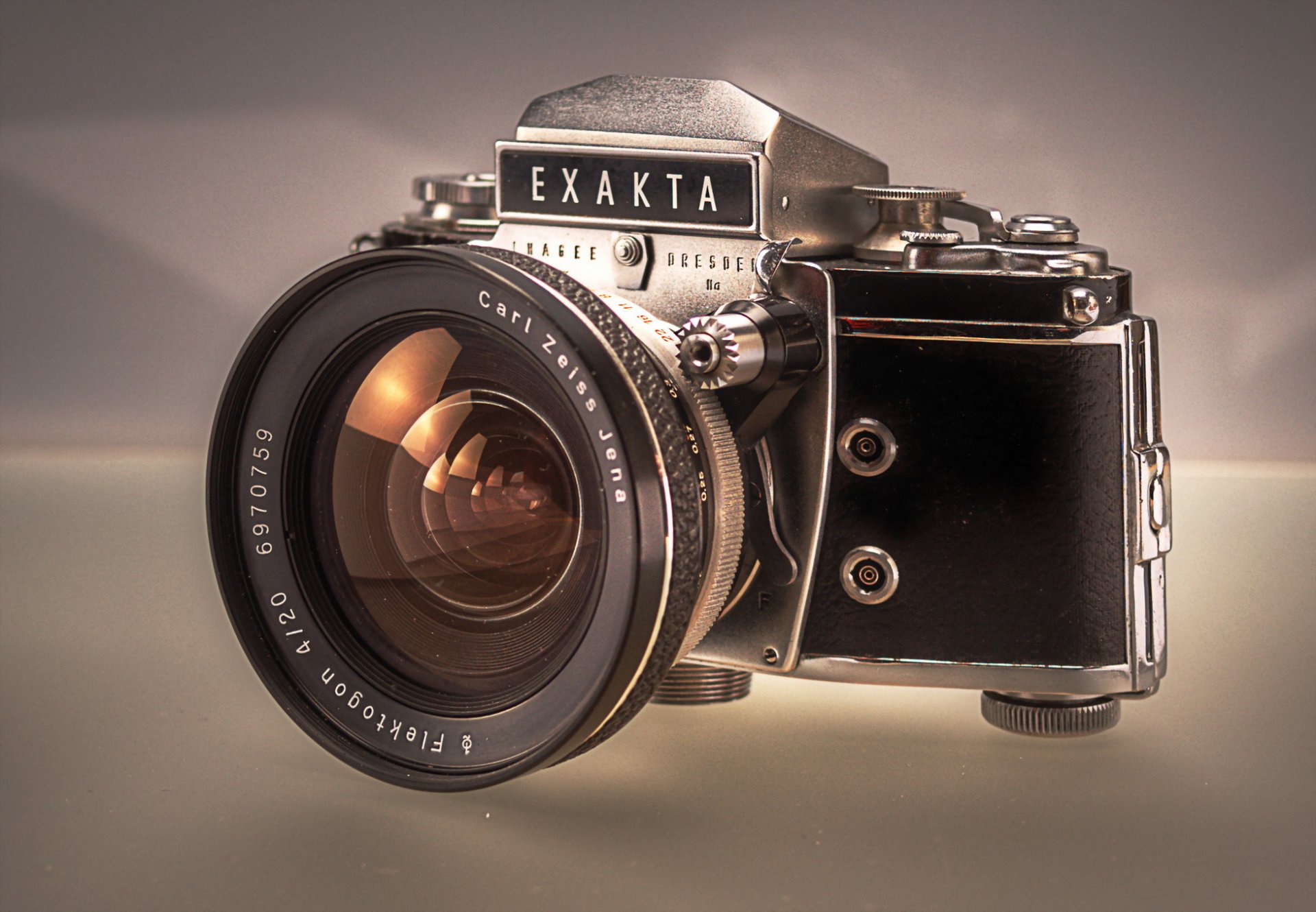 Makroaufnahme einer alten Kamera auf weißem Hintergrund