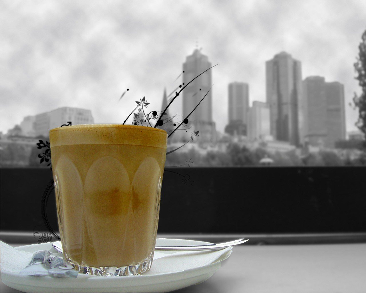 Glasbecher mit orangefarbenem Getränk auf weißem Teller auf schwarzem und weißem Stadthintergrund
