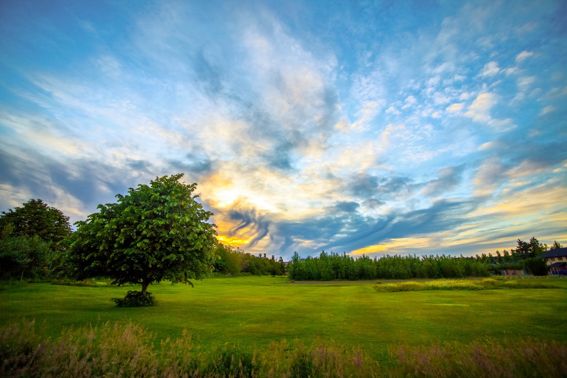 Eine Lichtung mit Bäumen und ein Haus im Morgengrauen