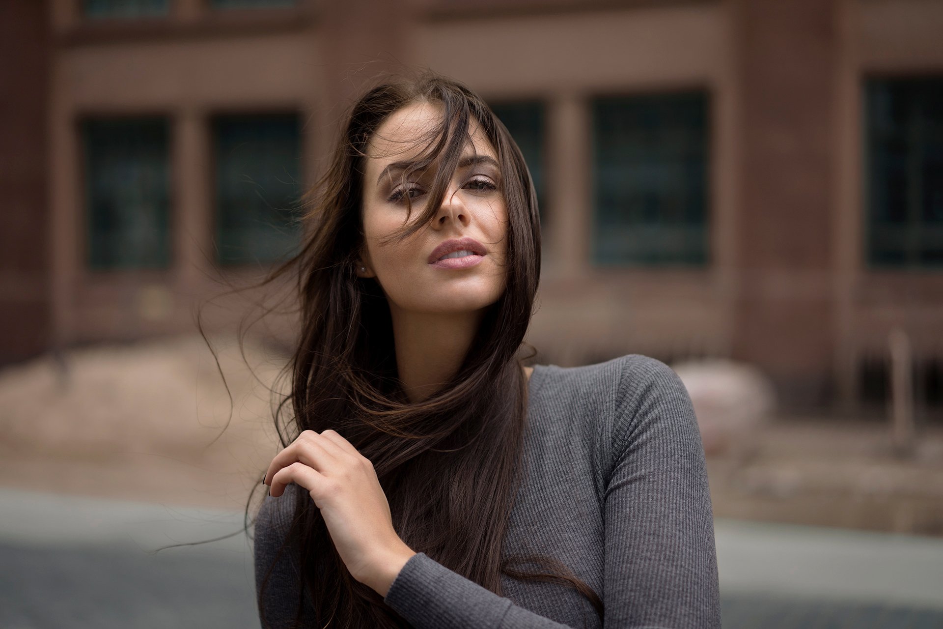 Mädchen posiert im Wind auf dem Hintergrund eines Gebäudes