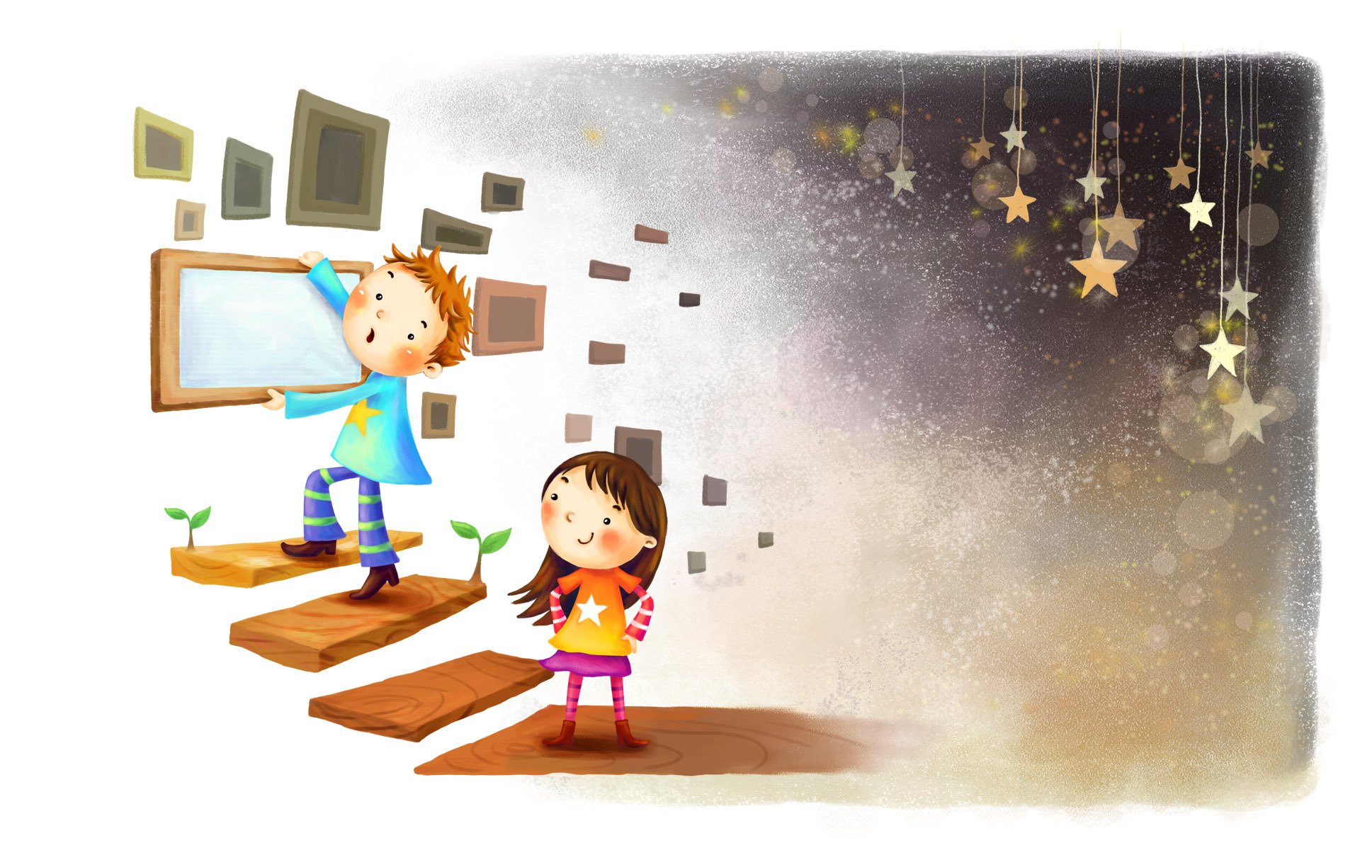 Zeichnung. Mädchen und Jungen hängen ein Bild auf