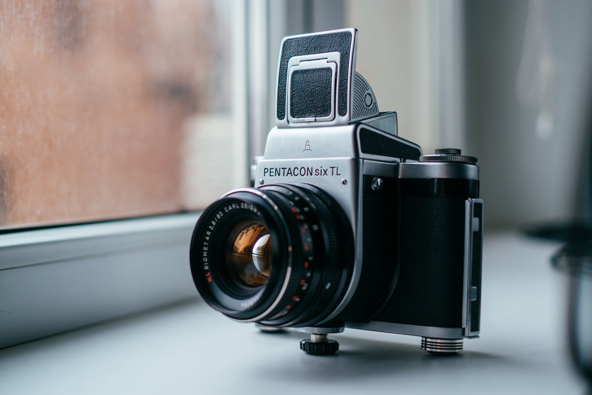 Makroaufnahme einer alten Kamera auf weißem Hintergrund