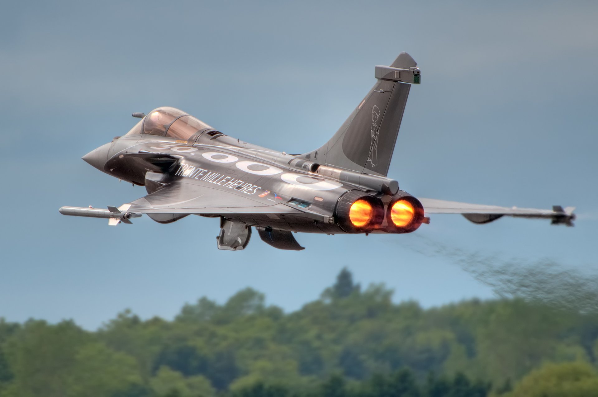 Abheben des Rafal-Kampfflugzeugs über dem Waldgebiet