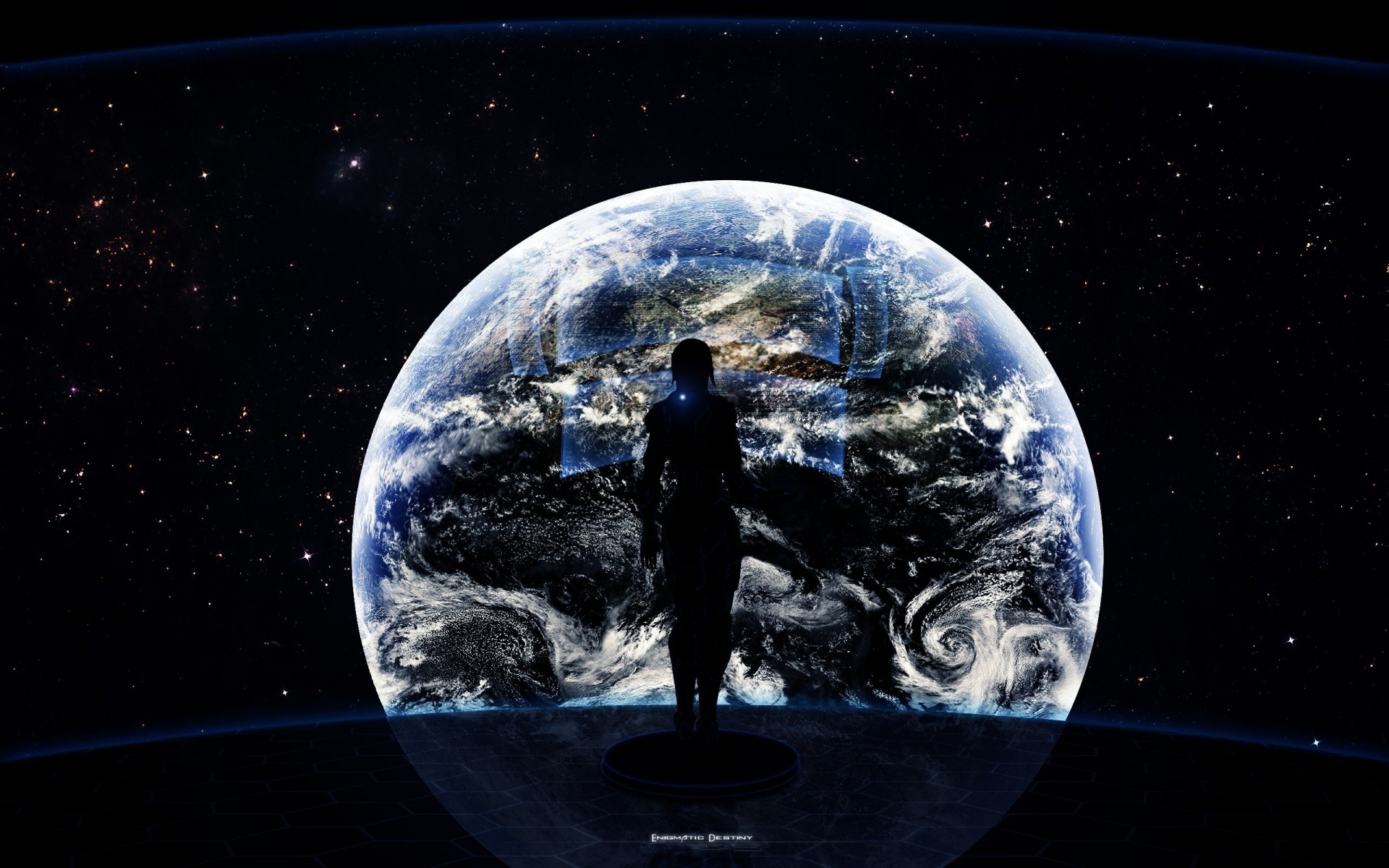 Ein Mann schaut aus dem Fenster des Schiffes auf einen Planeten im Weltraum