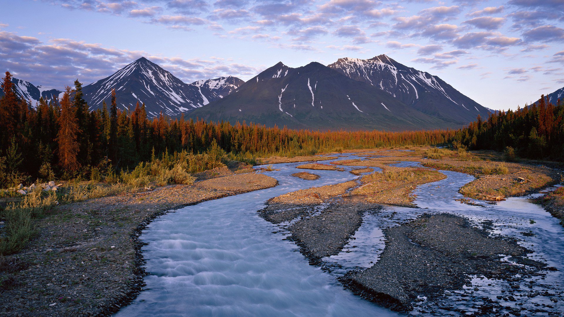 Flussfluss in den Bergen bei Sonnenuntergang