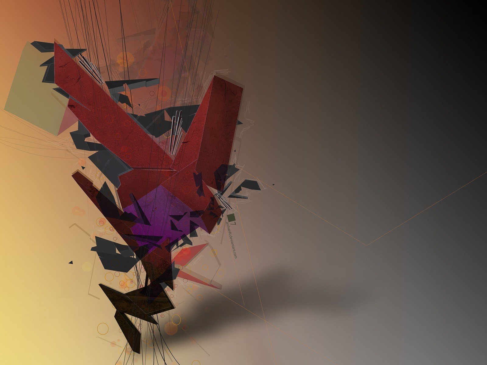 Abstrakte Figur aus rotem Lila und Grau auf grauem gelbem Hintergrund