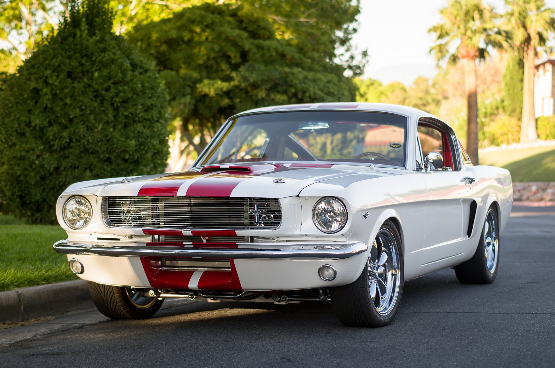Weißer Ford Mustang mit rotem Streifen am Stoßfänger