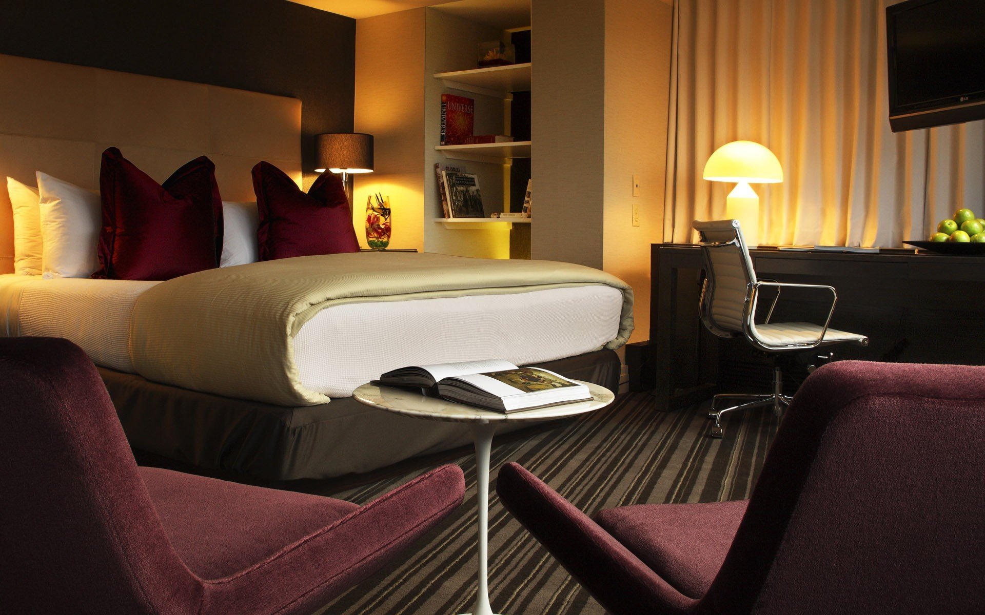 Das Interieur des Zimmers ist in violetten Farben und Holztönen gehalten