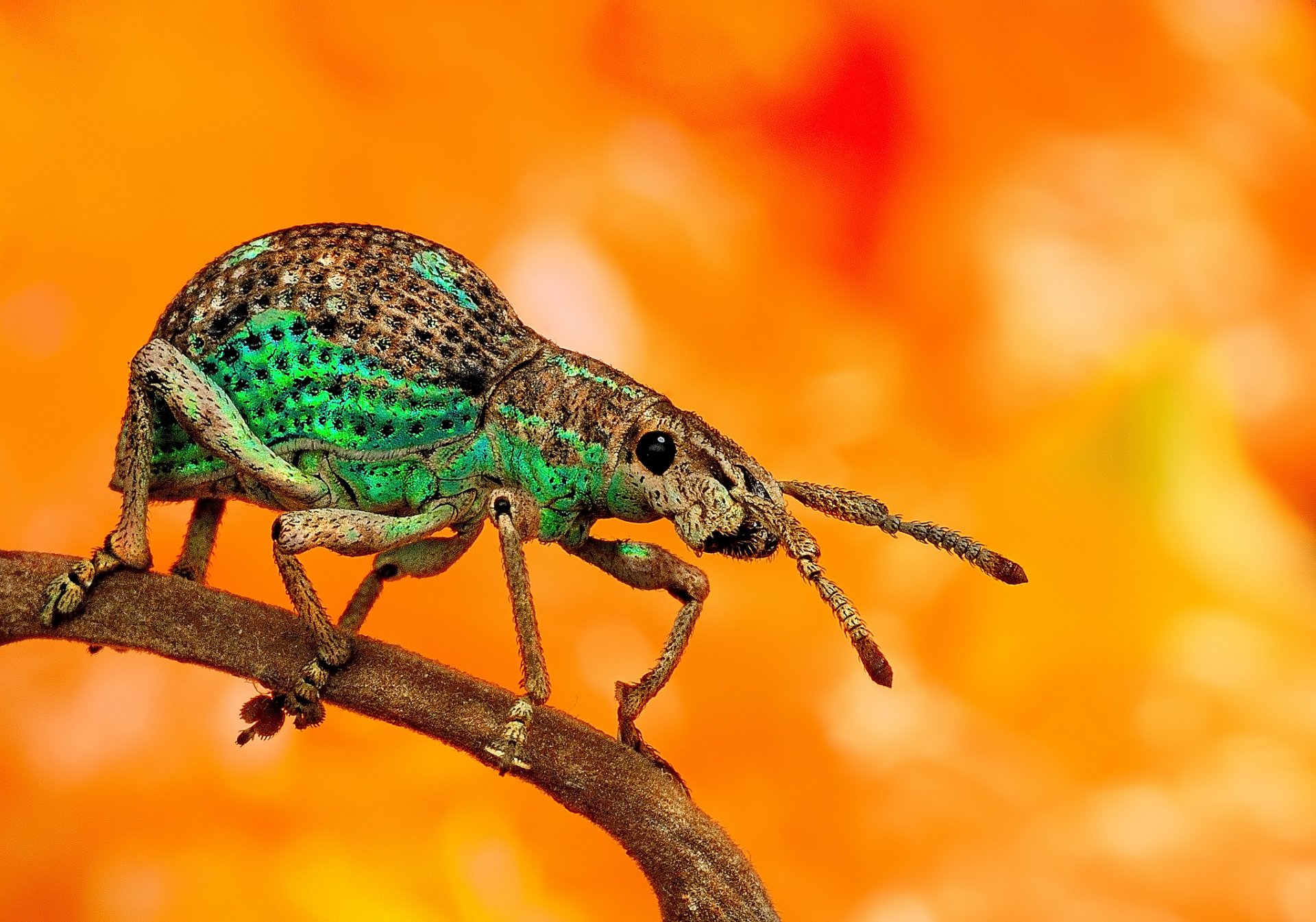 Ein Käfer mit Ranken sitzt auf einem Ast