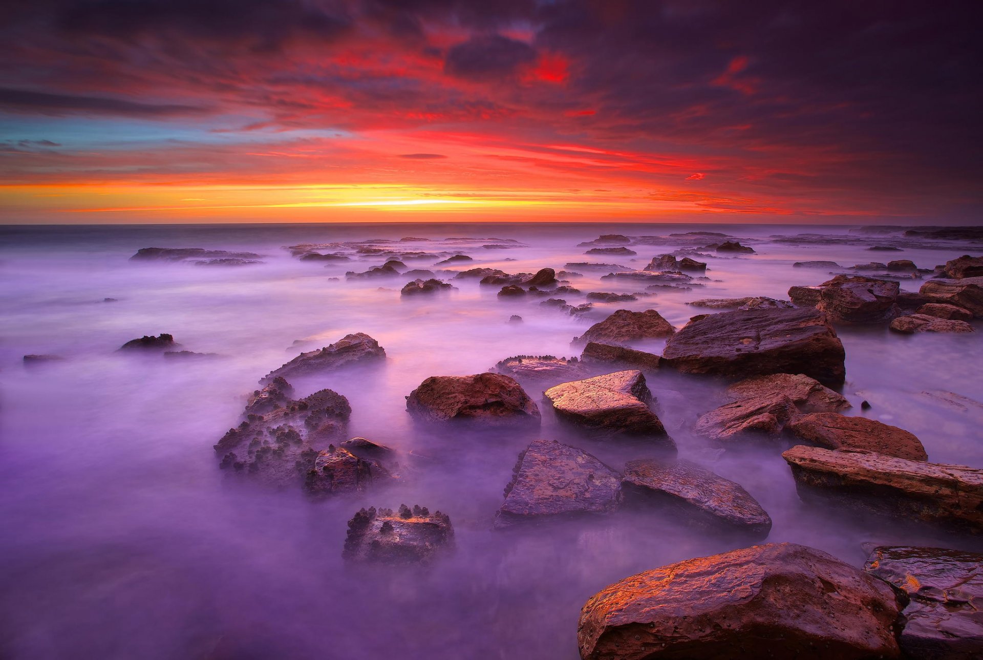 Sonnenaufgang am Strand des neuseeländischen Ozeans. Steine in den Wellen