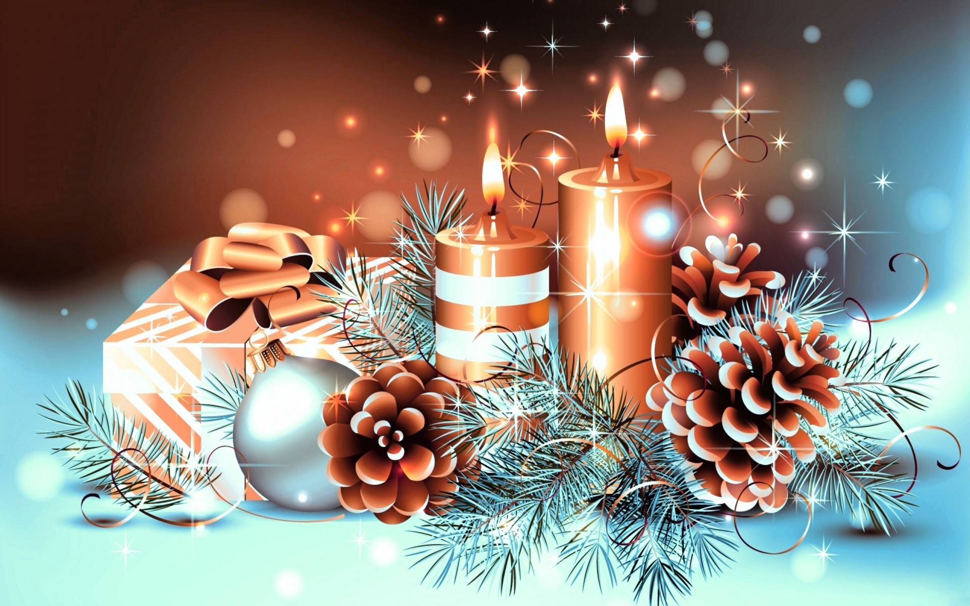 Neujahrskarte mit Kerzen, Geschenk und Zapfen