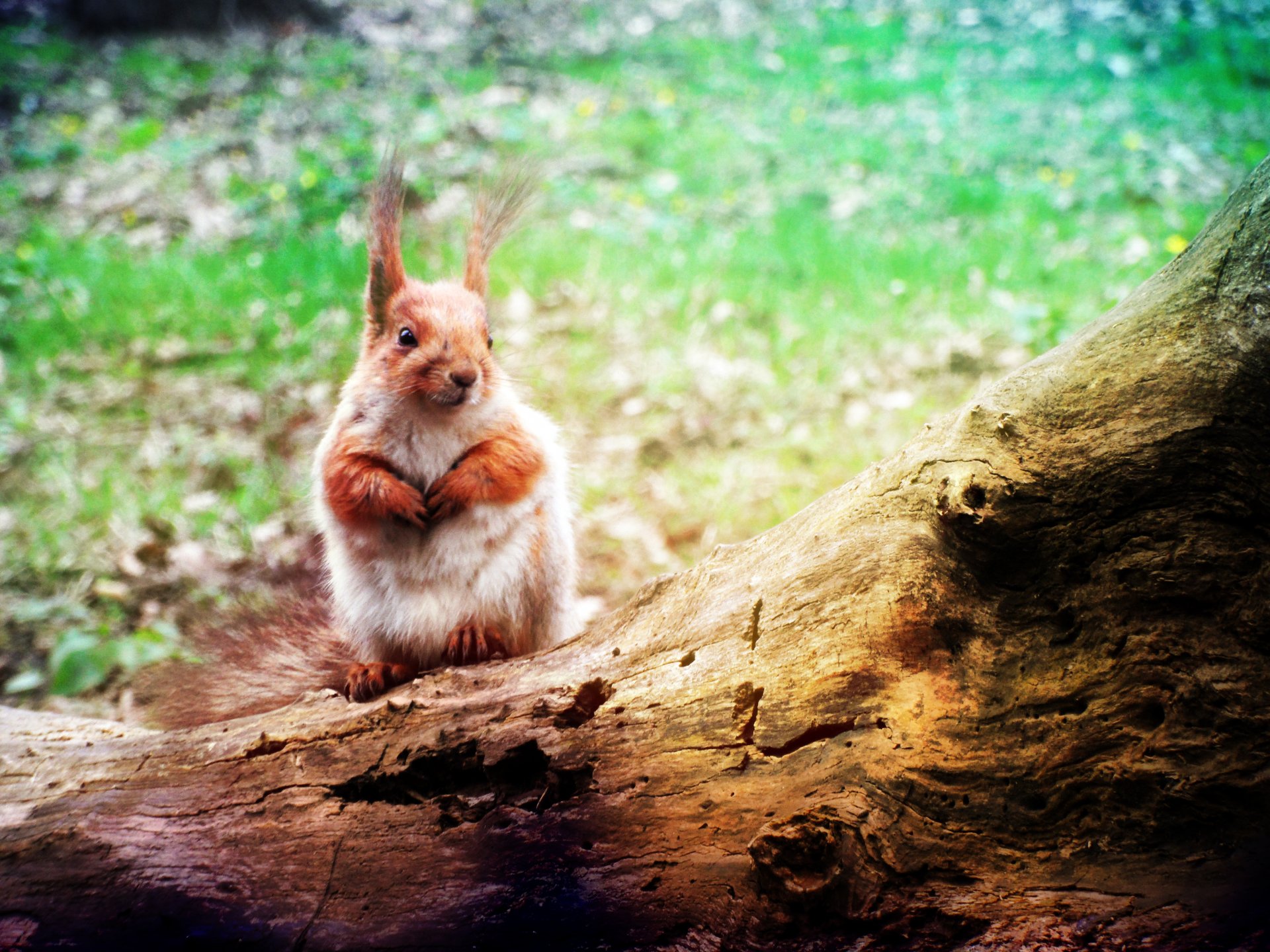 Ein kleines flauschiges Eichhörnchen sitzt auf einem umgestürzten Baum