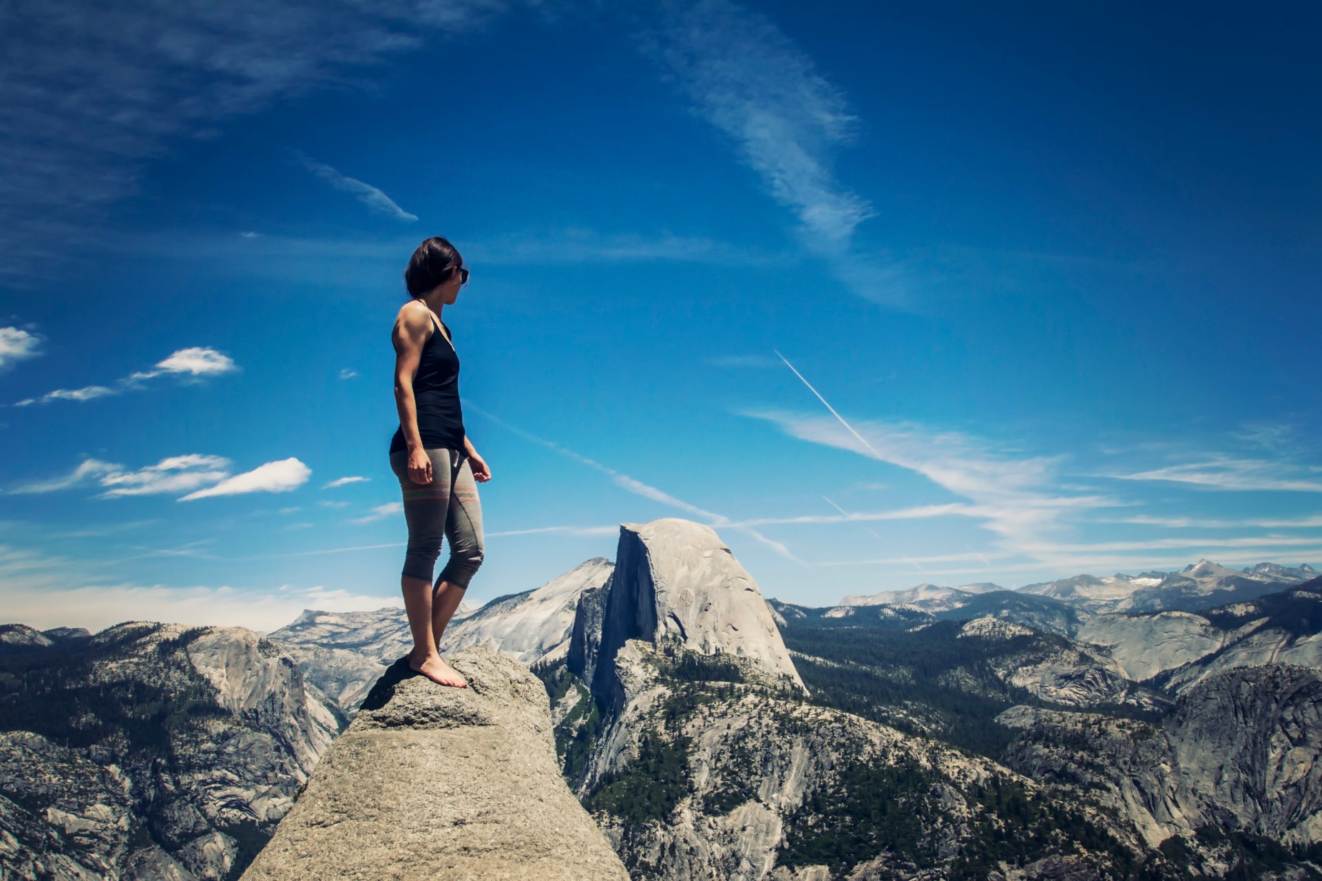Mädchen steht über einer Klippe in einem malerischen Tal