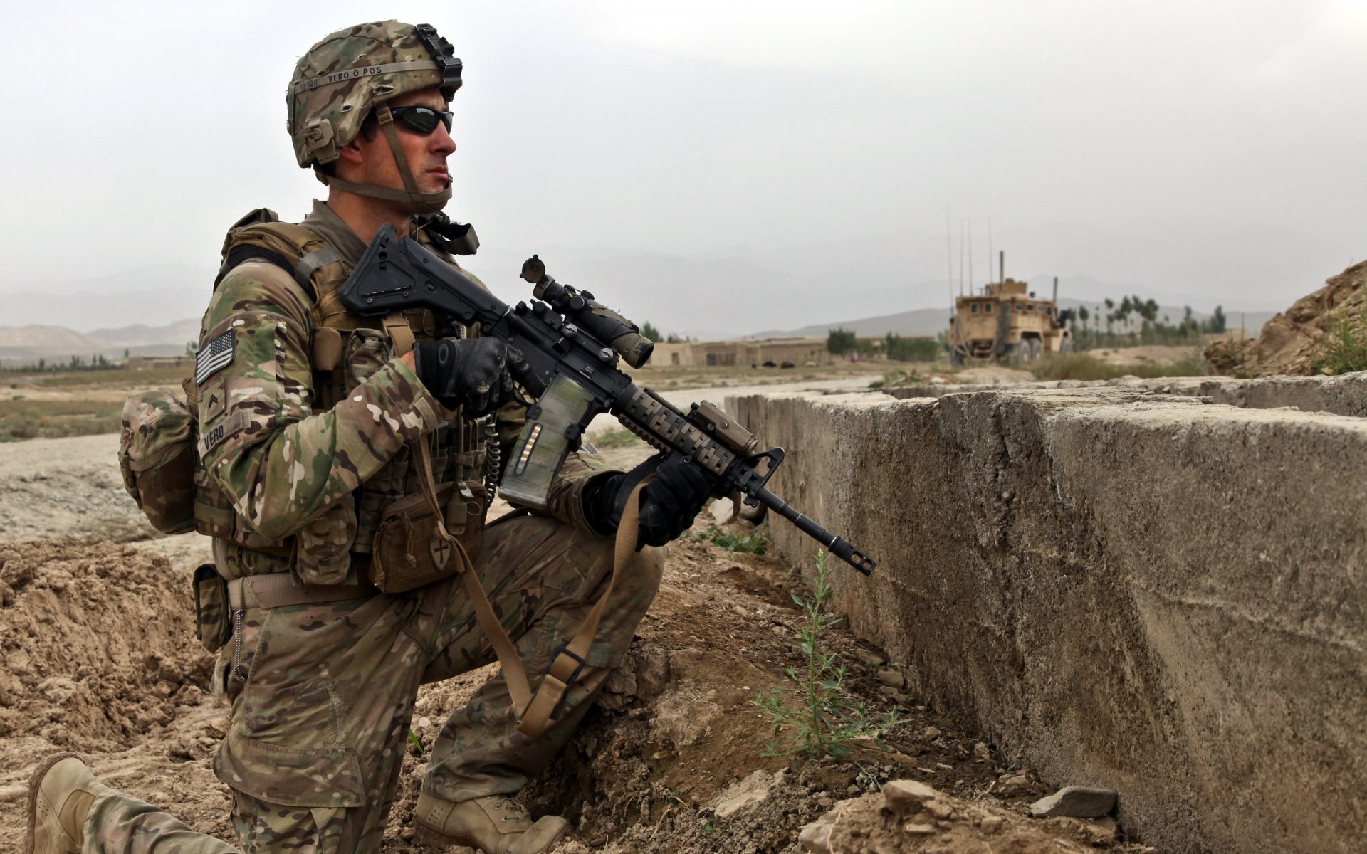 Soldat mit Waffen auf einem verlassenen Gelände Hintergrund