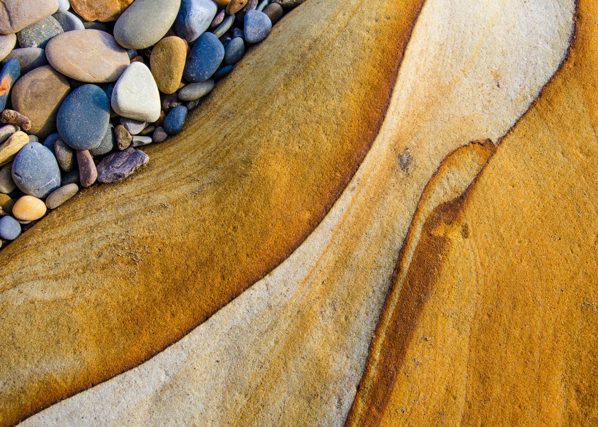 Bunte Kieselsteine neben einem großen Kopfsteinpflaster