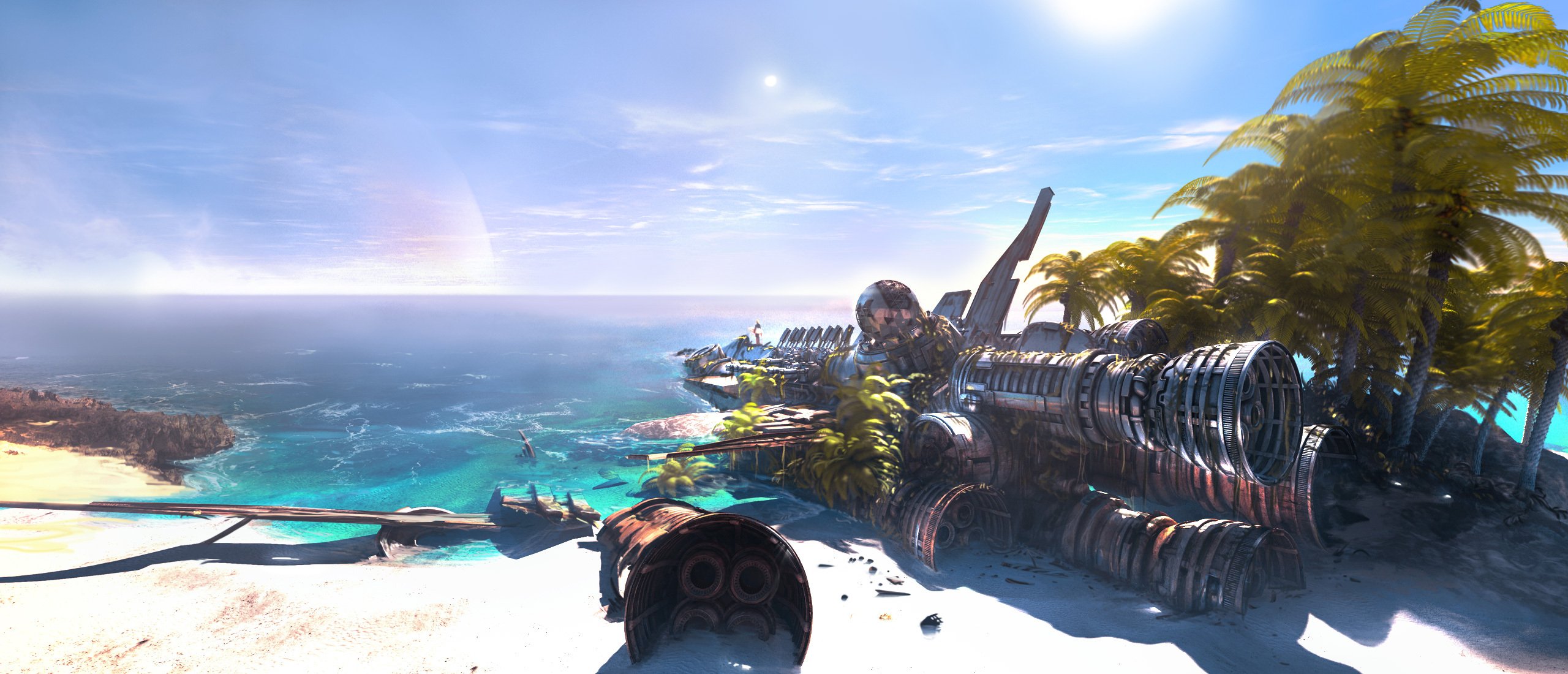 Kunst des Raumschiff-Wracks vor dem Hintergrund des ruhigen Meeres und der sandigen Küste