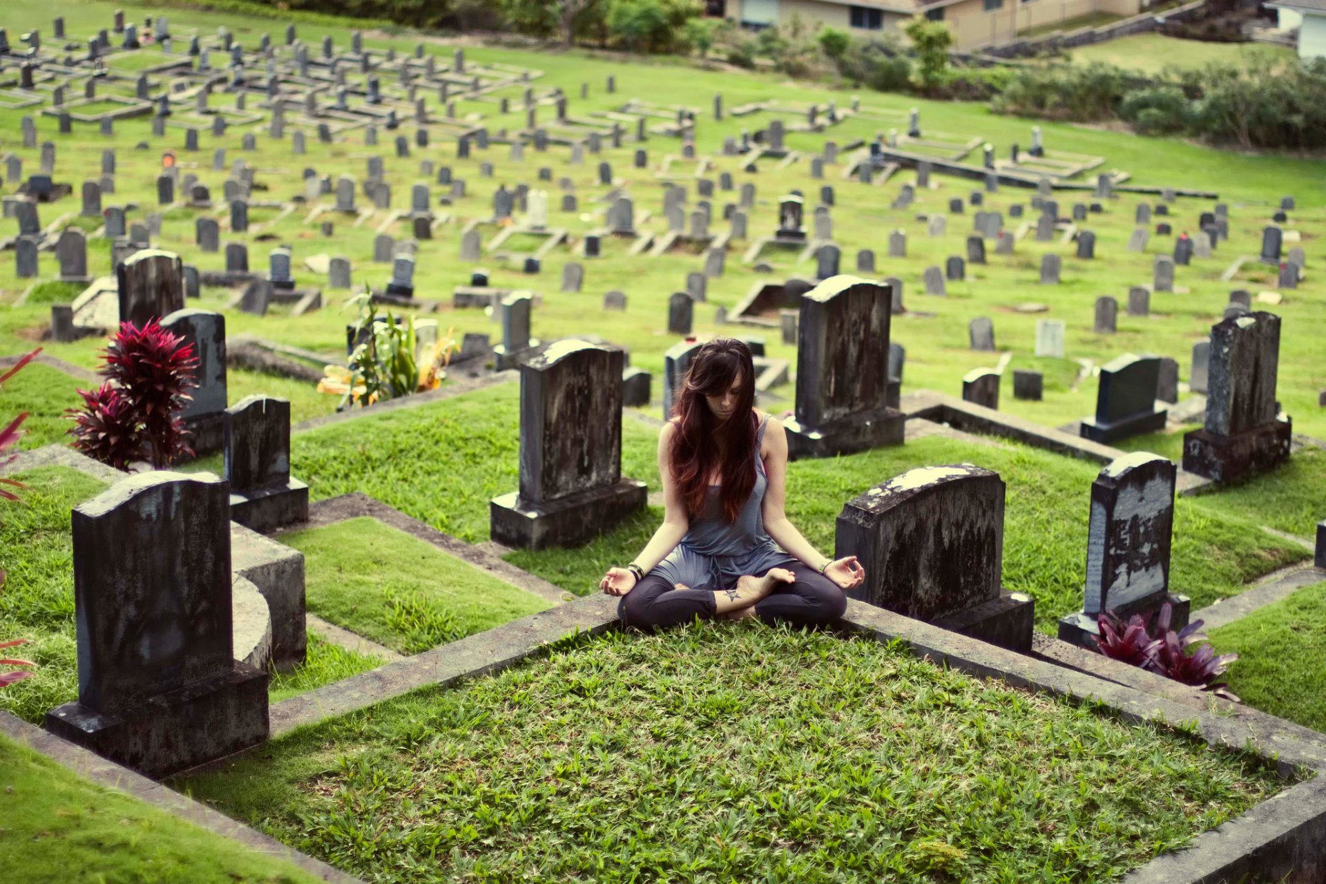 Mädchen in Lotus-Pose auf einem grünen Friedhof