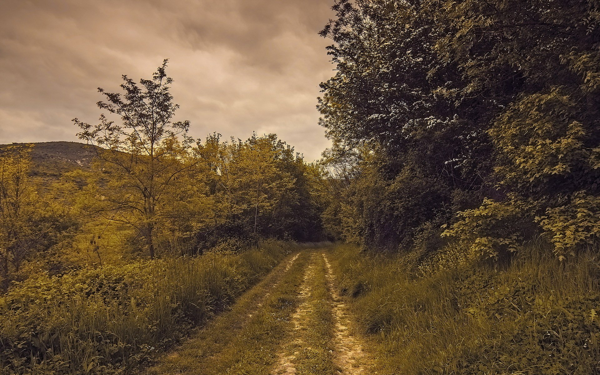Waldweg bei sonnigen Sonnenuntergängen im Sommer