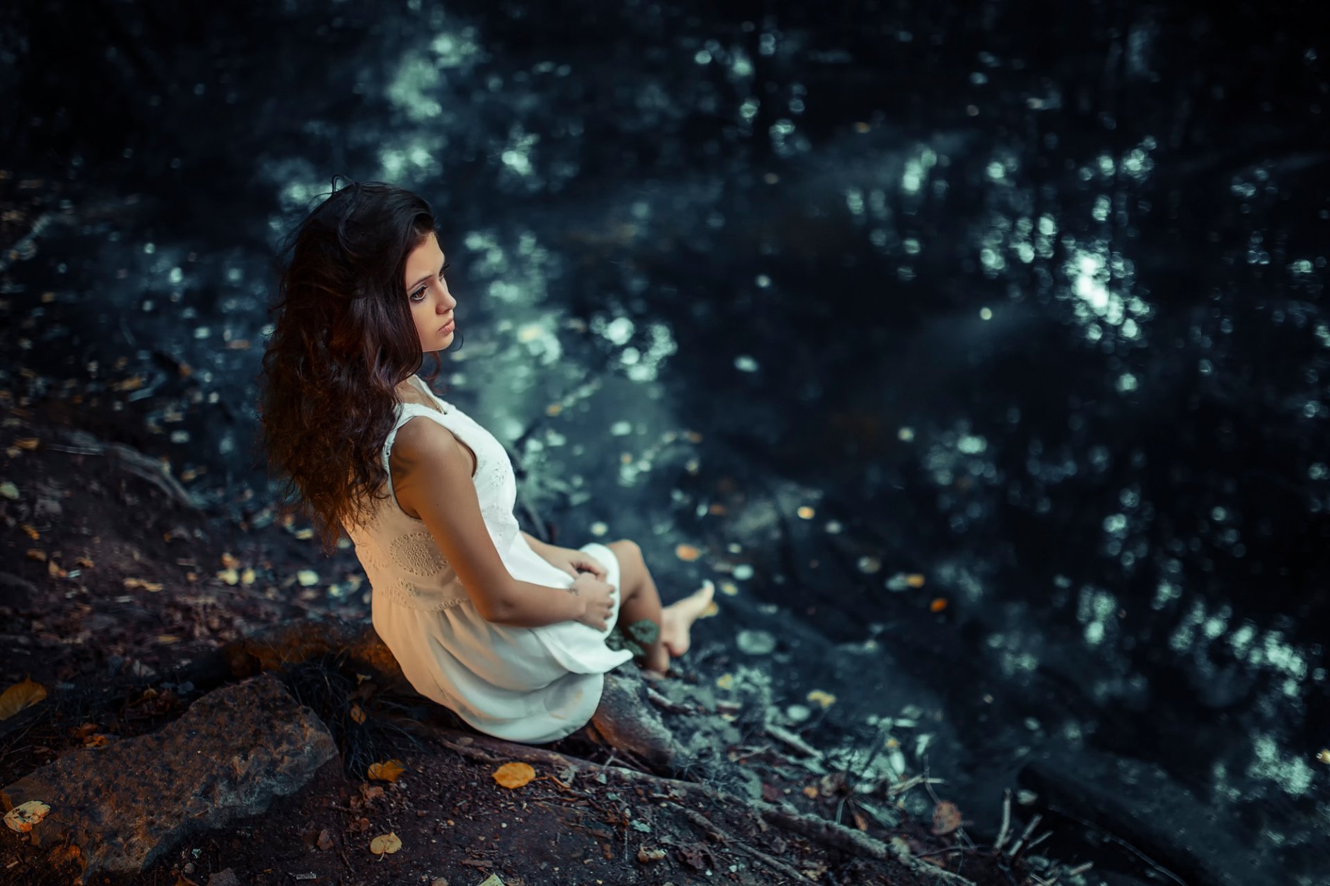 Karina mit braunen augen im weißen kleid am felsigen ufer