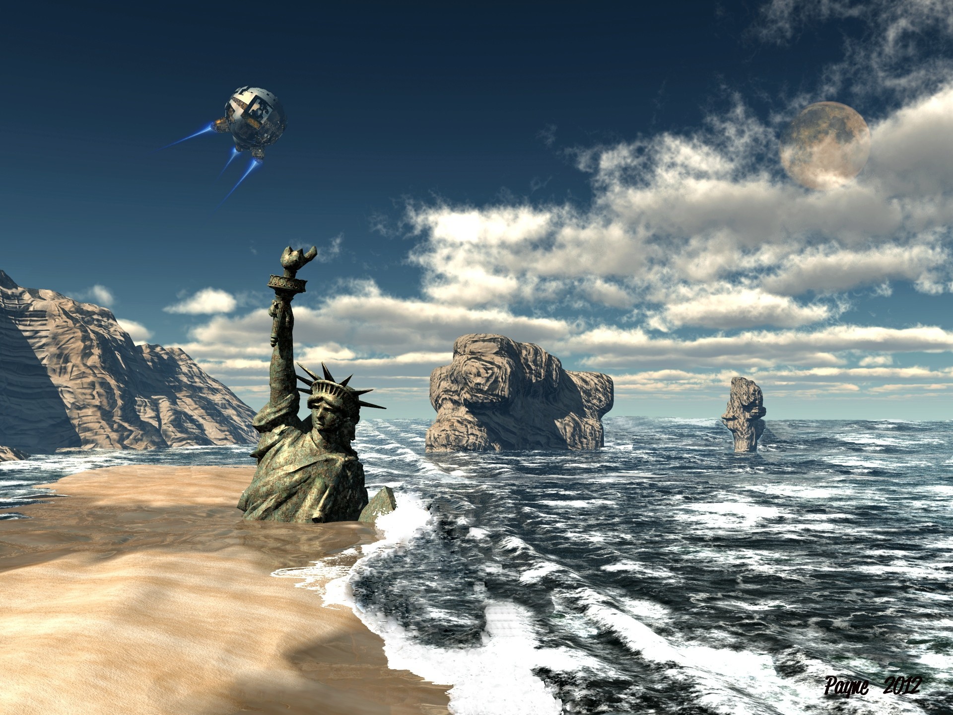 Die Freiheitsstatue ragt am Meer aus dem Sand