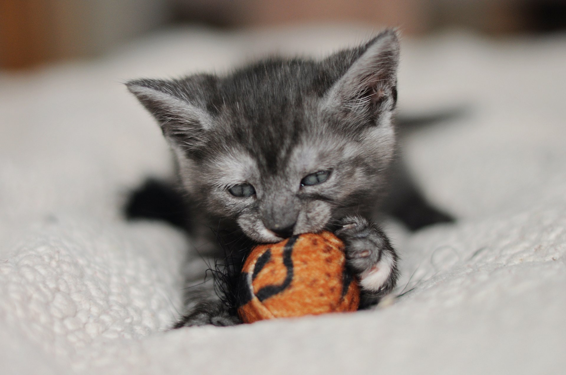 Graues Kätzchen nagt am Ball