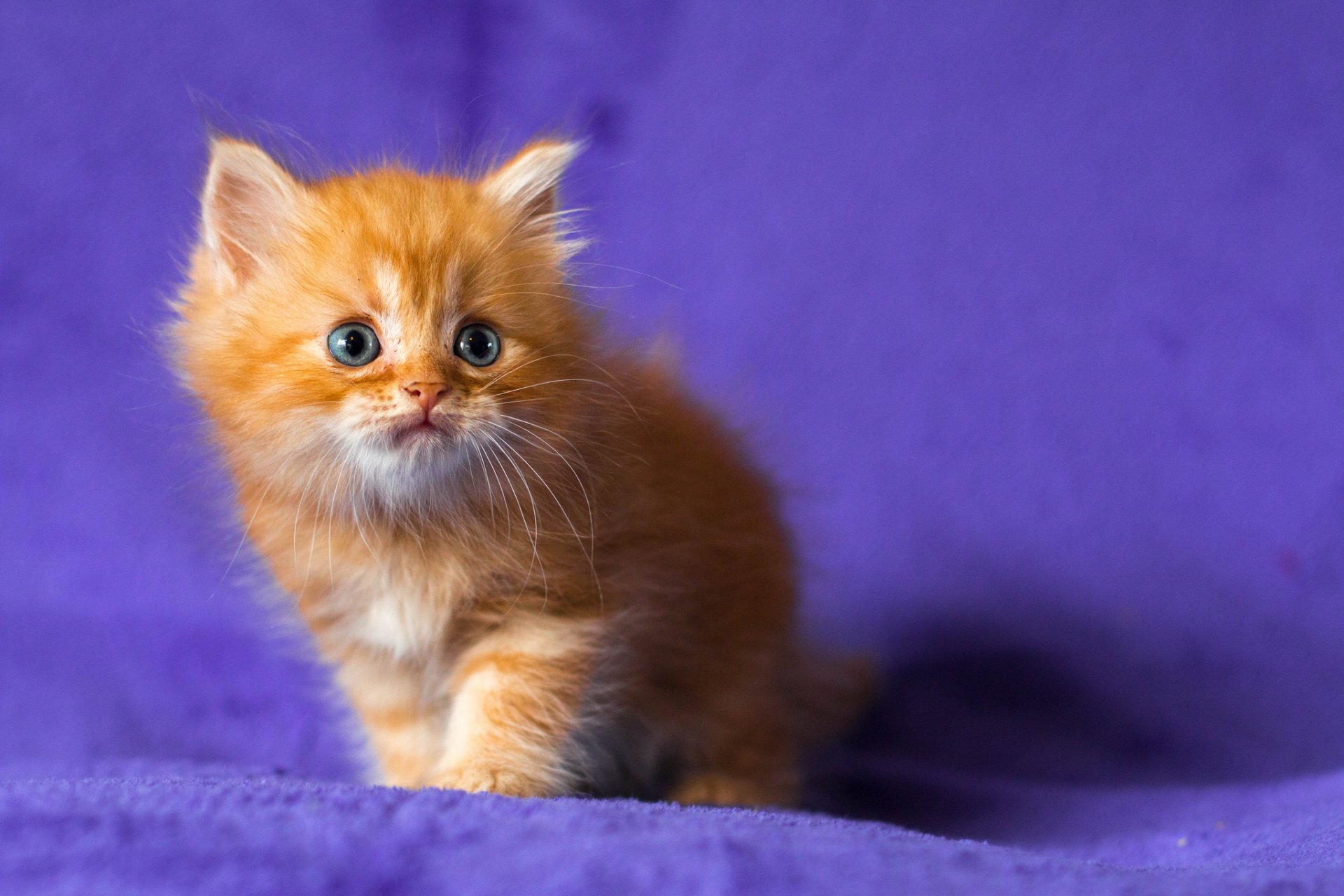 Blauäugiges rotes Kätzchen auf lila Hintergrund