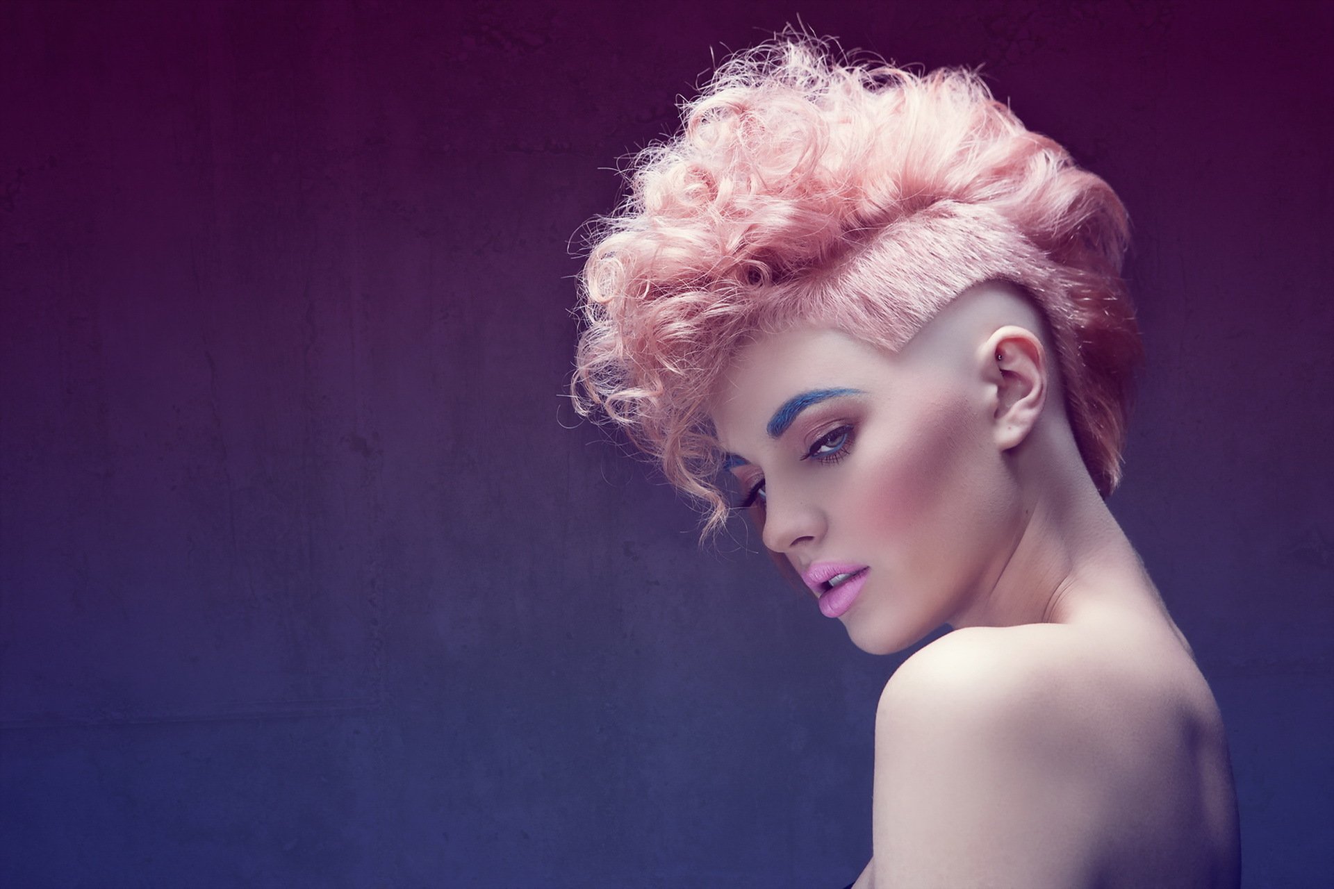 Mädchen auf lila Hintergrund mit schönem Make-up