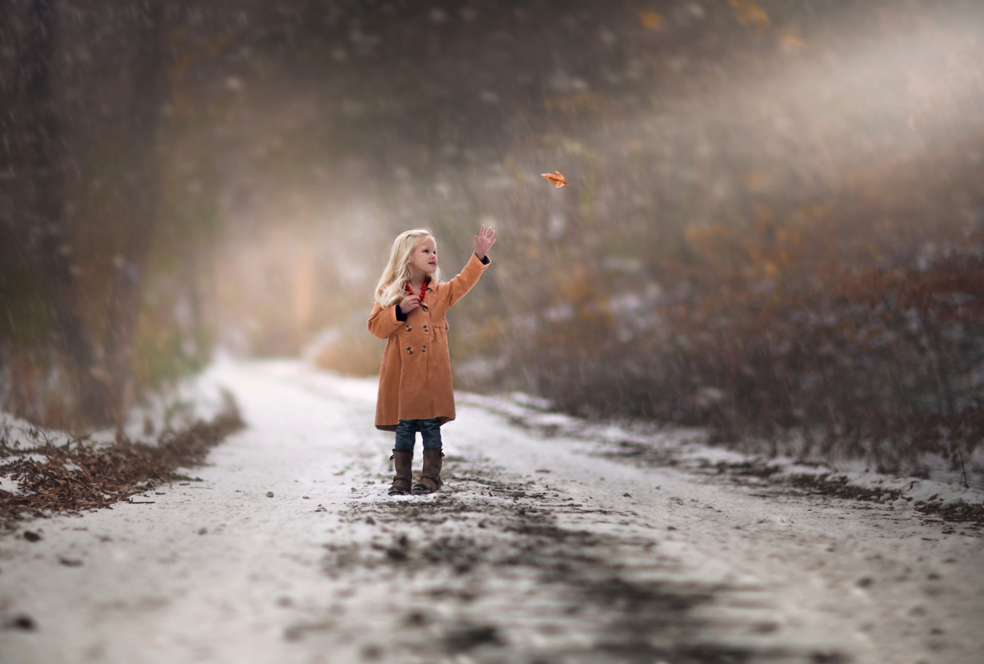 Ein Mädchen steht auf einer verschneiten Straße und fängt ein Blatt