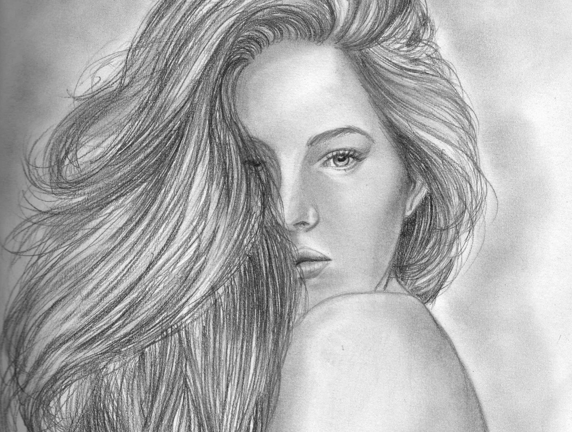 Bleistiftzeichnung eines Mädchens mit Blick über die Schulter
