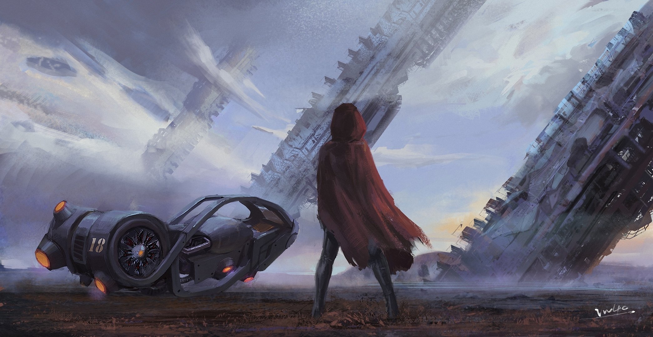 Das Mädchen auf einem Motorrad kam zum kosmischen Karabel