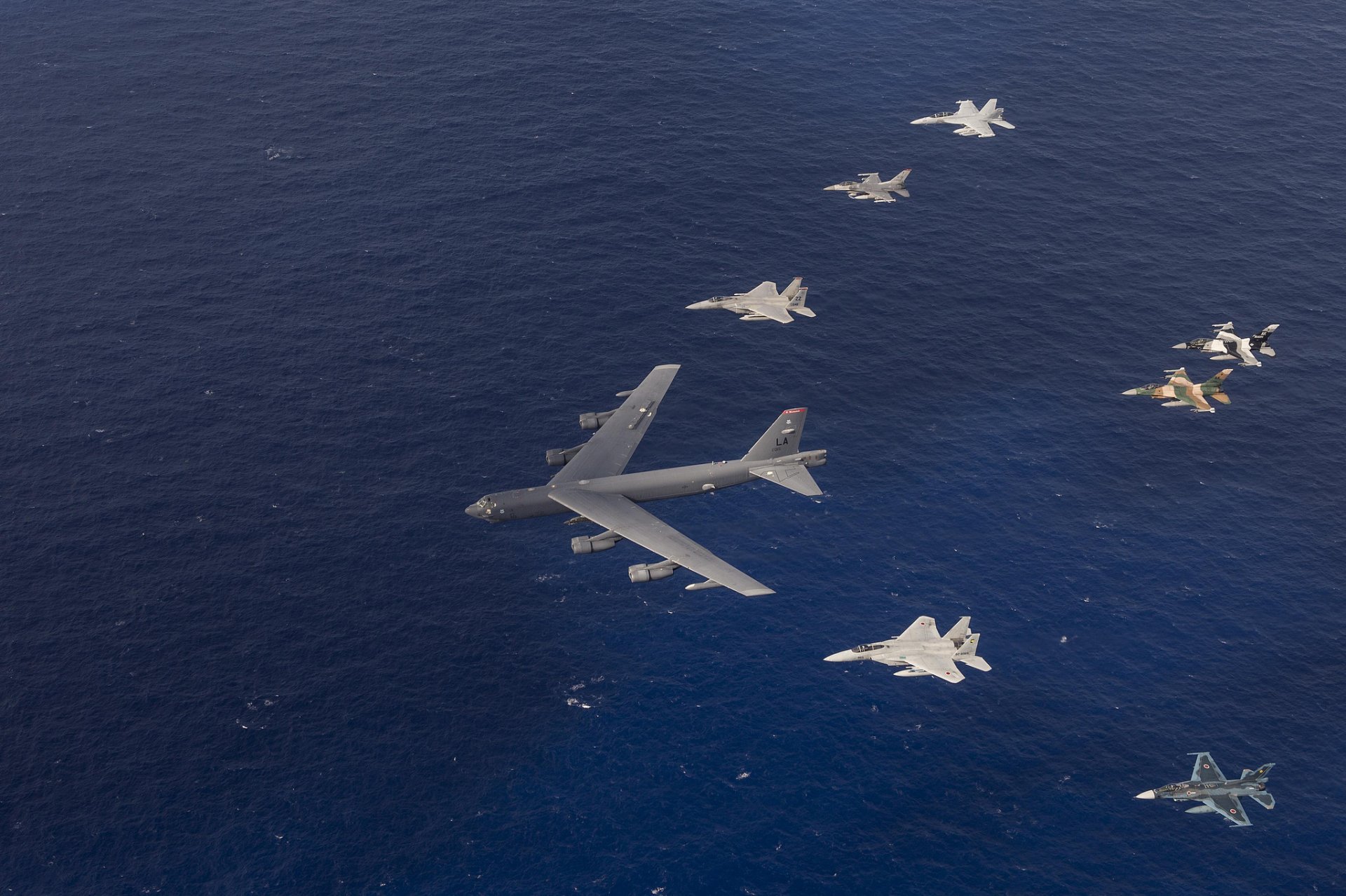 Ein großes Flugzeug fliegt durch den blauen Himmel