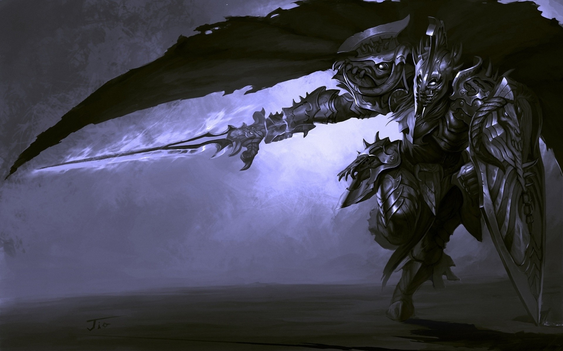 Ein Krieger in dunkler Rüstung läuft mit flatterndem Mantel