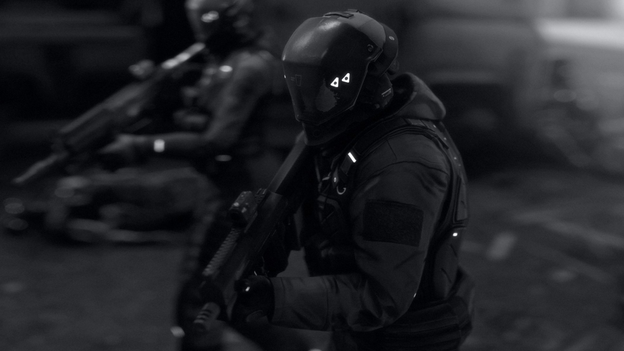 Ein Söldner in einer kugelsicheren Weste mit einem Maschinengewehr. Der Mann im Helm