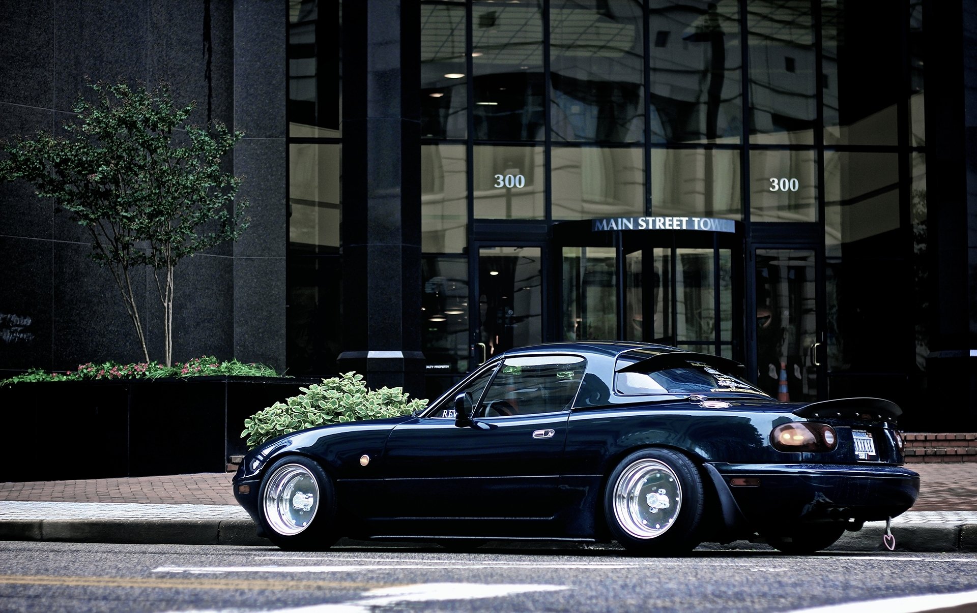 Dunkelblaues Mazda Coupé in städtischen Umgebungen