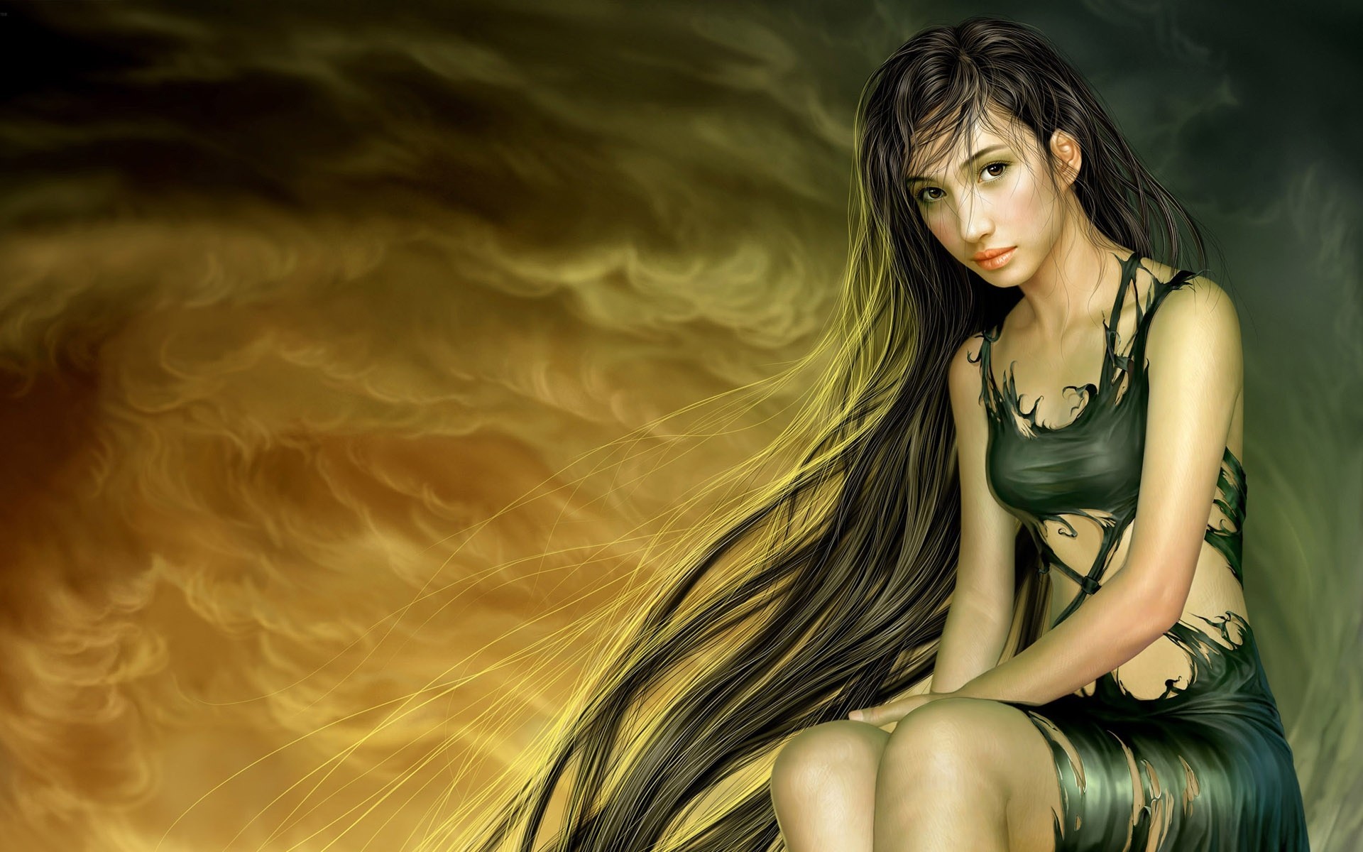 Trauriges Mädchen mit langen Haaren am Glühen des Feuers