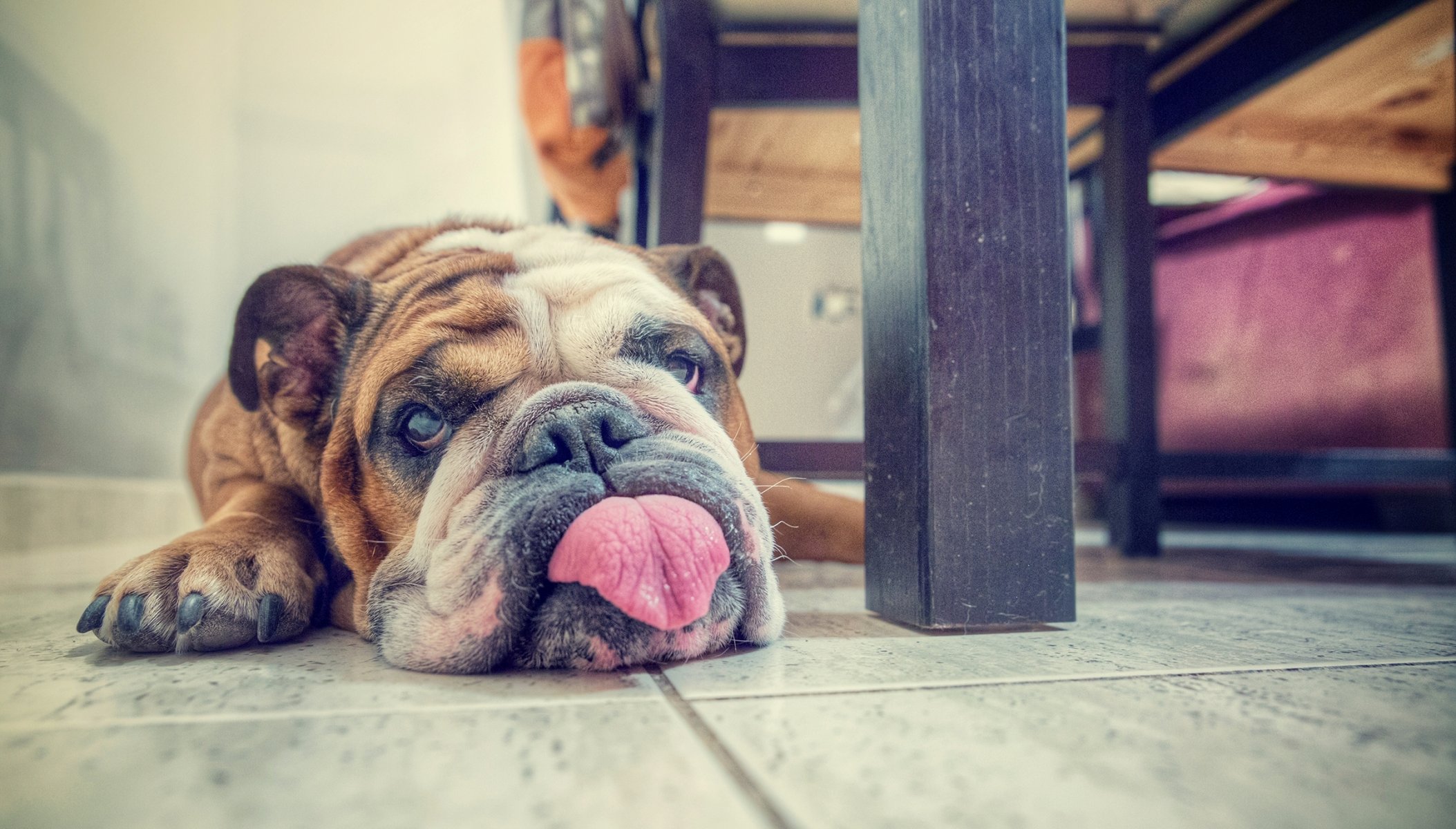 Der Hund liegt mit ausgestreckter Zunge auf dem Boden