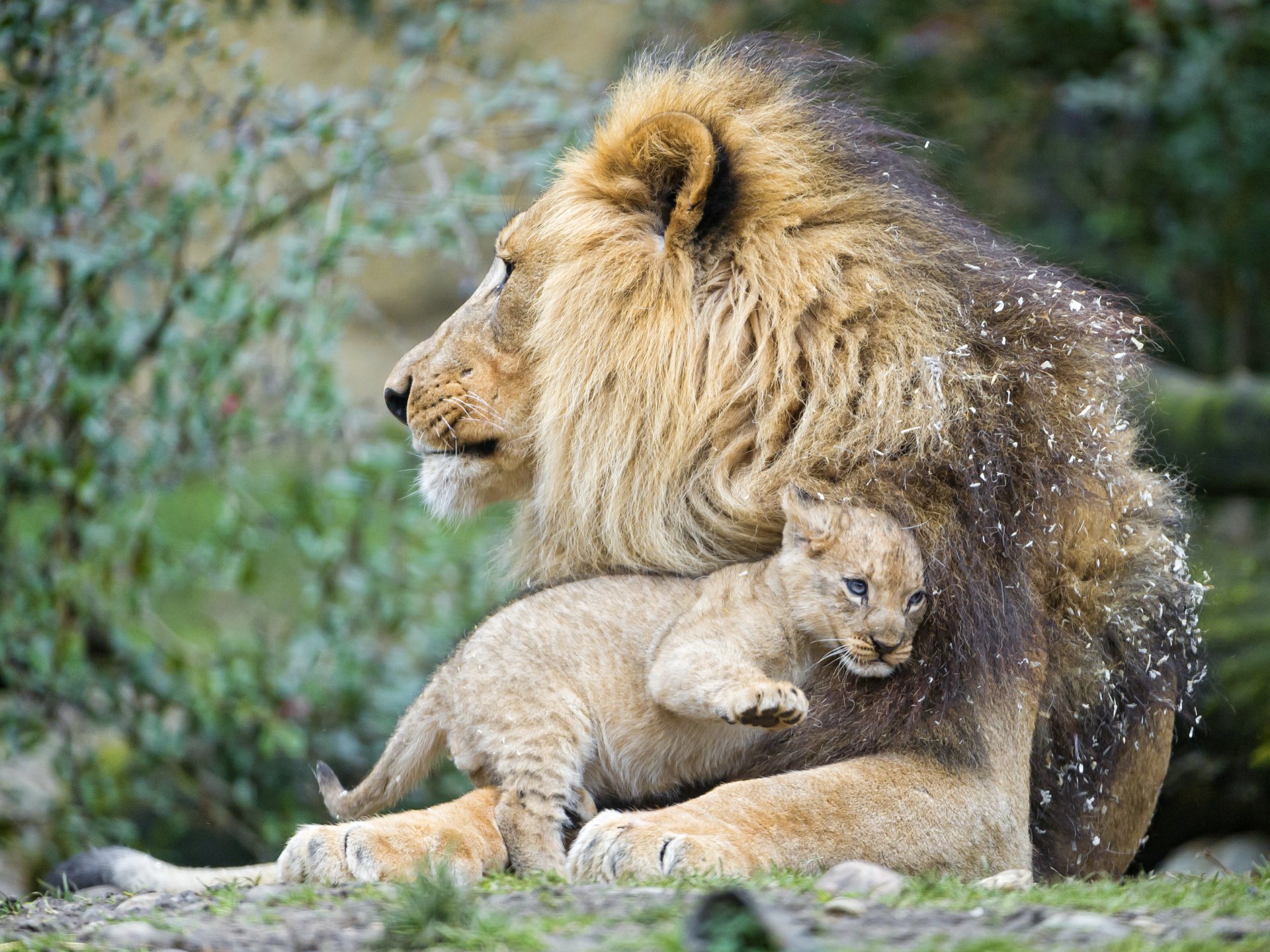 Zärtliche Umarmungen. Löwe mit Jungtier