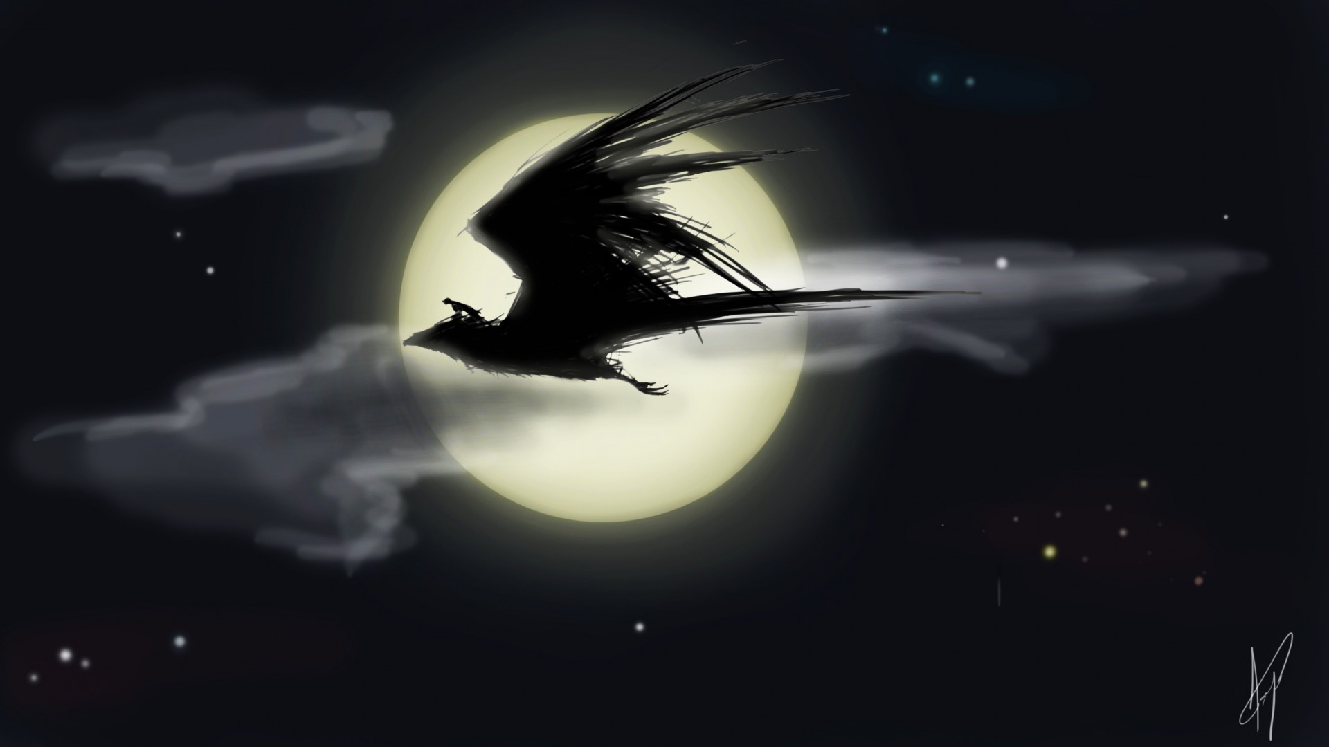 Reiter auf Vogel in der Nacht auf Mond Hintergrund