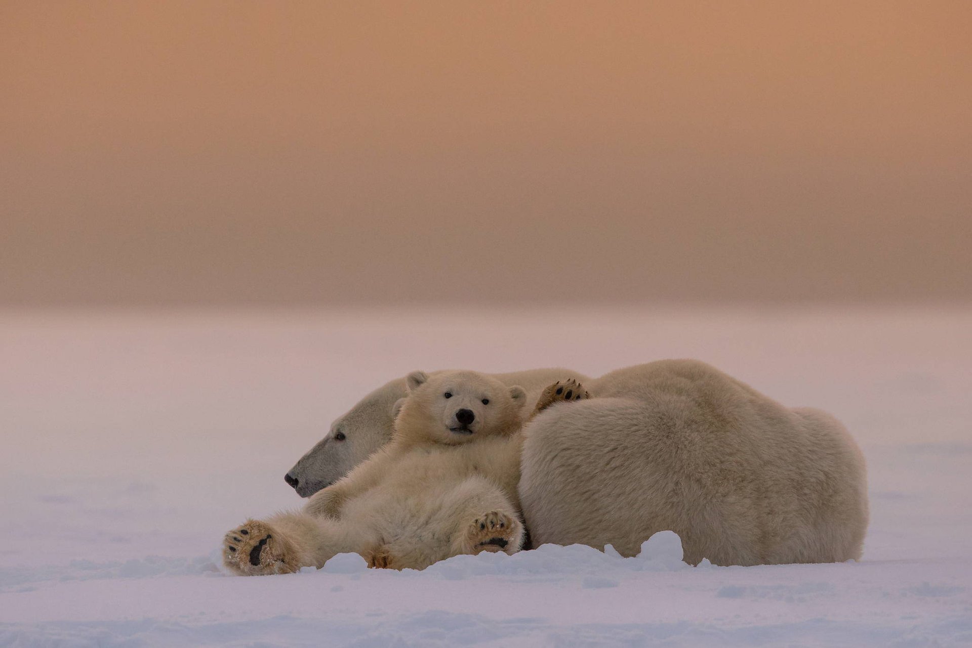 Bär mit Mutter Eisbär ruht sich im Schnee aus