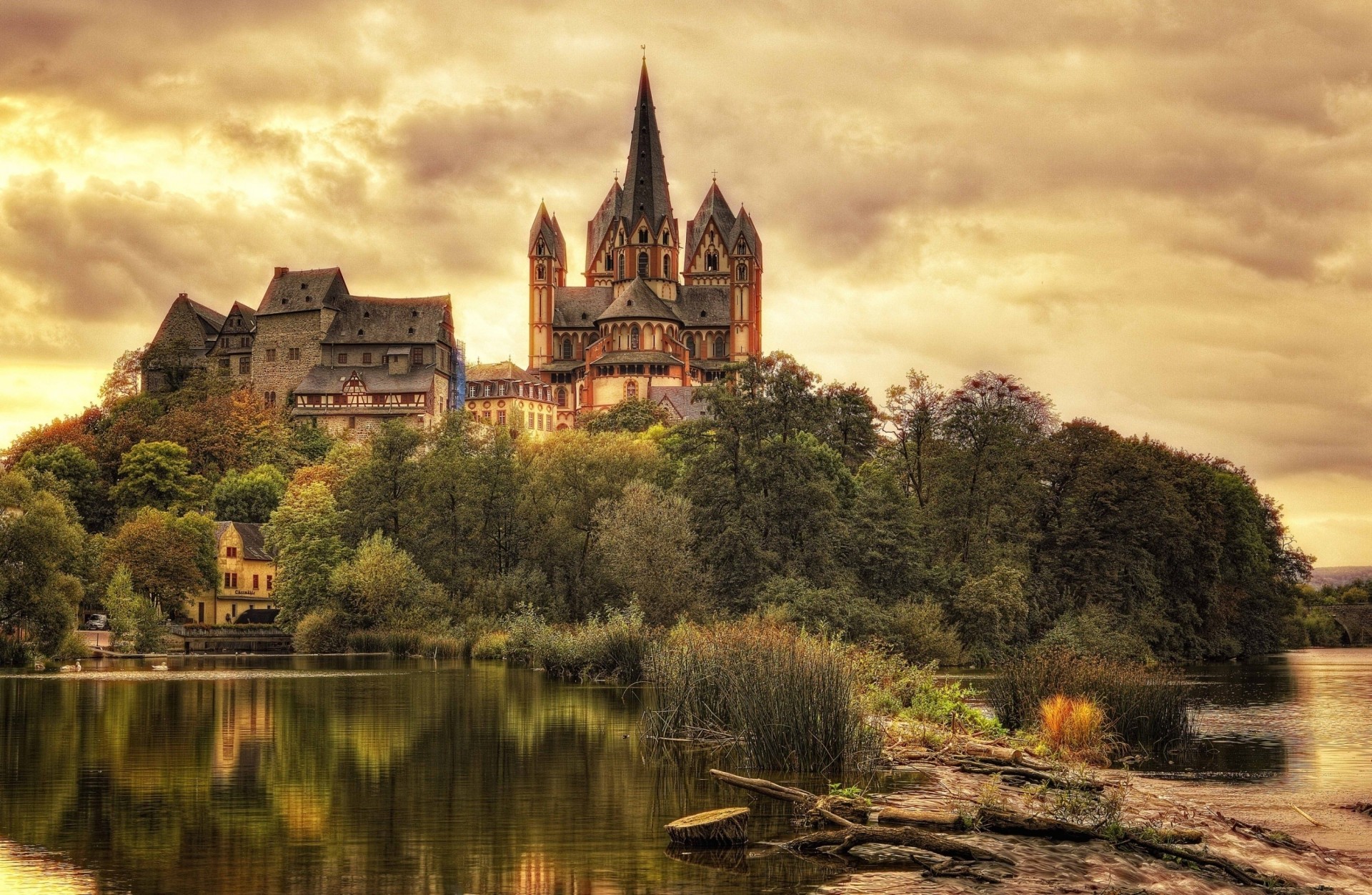 Der Weg, der in die Ferne führt, ist in einem Park mit gelbem Laub übersät