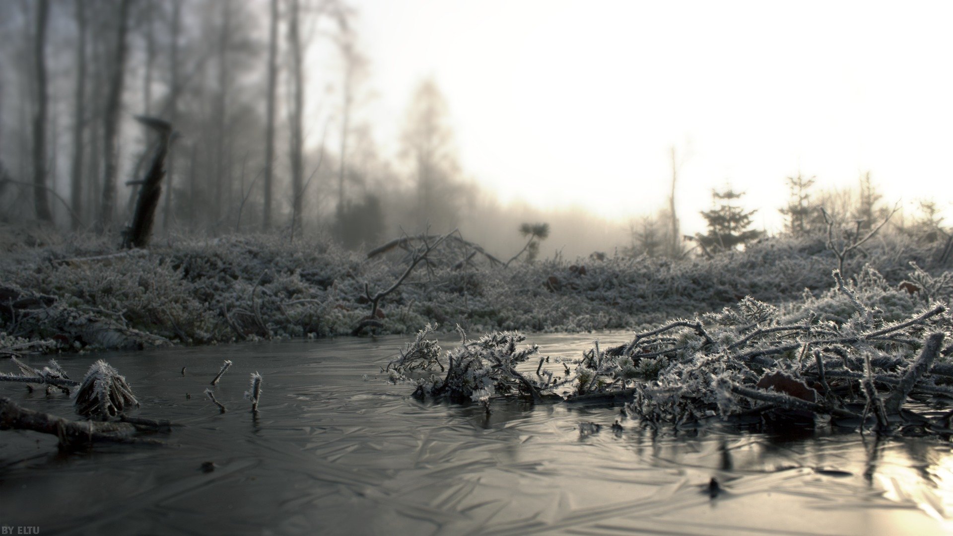 Frostiger Winterhimmel am Morgen. Schneebedeckte Fichte