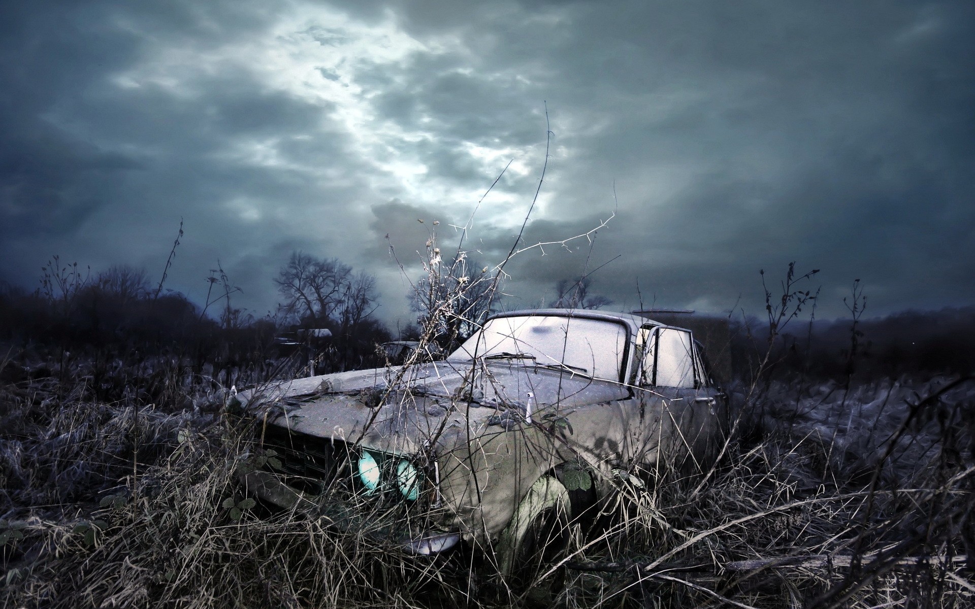 Altes Auto mit eingeschalteten Scheinwerfern in der Natur